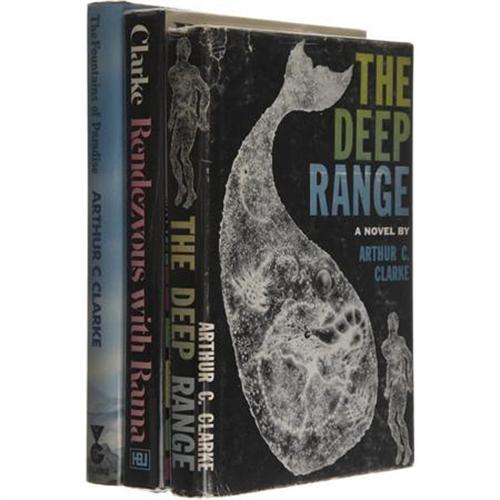 <B>Arthur C. Clark: Three Books.</B></I> Includes the following:<BR><B><I>The Deep Range.</B></I></B></I> (New York: Harcourt, Brace and Company, 1957), second edition, 238 pages, green boards, 8vo, dust jacket. Condition (book/ dj): very good/ good.<BR><B><I>The Fountains of Paradise.</B></I></B></I> (London: Victor Gollancz Ltd., 1979), first English edition, 255 pages, blue boards, 8vo, dust jacket clipped. Condition (book/ dj): about fine/ fine.<BR><B><I>Rendezvous With Rama.</B></I></B></I> (New York: Harcourt Brace Jovnovich, Inc., 1973), first edition, 303 pages, black boards, 8vo, dust jacket. Condition (book/ dj): fine/ near fine.<BR><BR><BR><b>Shipping:</b> Books & Catalogs (<a target="_blank" href="http://www.heritageauctions.com/common/shipping.php">view shipping information</a>)