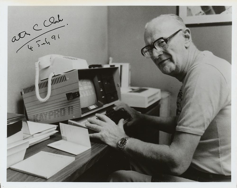 Glossy 10 x 8 photo of the adored science-fiction writer seated in front of a Kaypro II computer, signed in black felt tip, "Arthur C. Clarke, 4 July 91." In fine condition, with some small creases along the top edge.