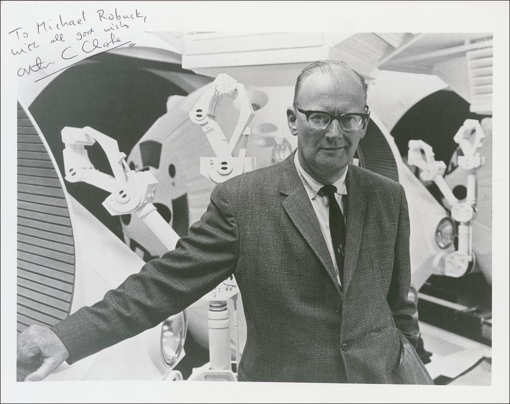 Glossy 10 x 8 photo of Clarke posing in front of a robot, signed and inscribed in black ballpoint “To Michael Robuck, with all good wishes, Arthur C. Clarke.” In fine condition, with a few scattered light creases and surface marks.