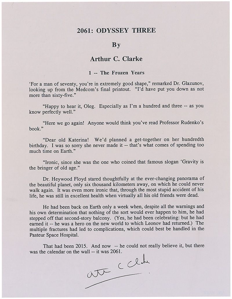 Souvenir typescript of the beginning of 2061 Odyssey Three, one page, 8.5 x 11. In part: “Dr. Heywood Floyd stared thoughtfully at the ever-changing panorama of the beautiful planet, only six thousand kilometers away, on which he could never walk again. It was even more ironic that, through the most stupid accident of his life, he was still in excellent health when virtually all his old friends were dead.” Signed at the bottom in black ink by Clarke. In fine condition.