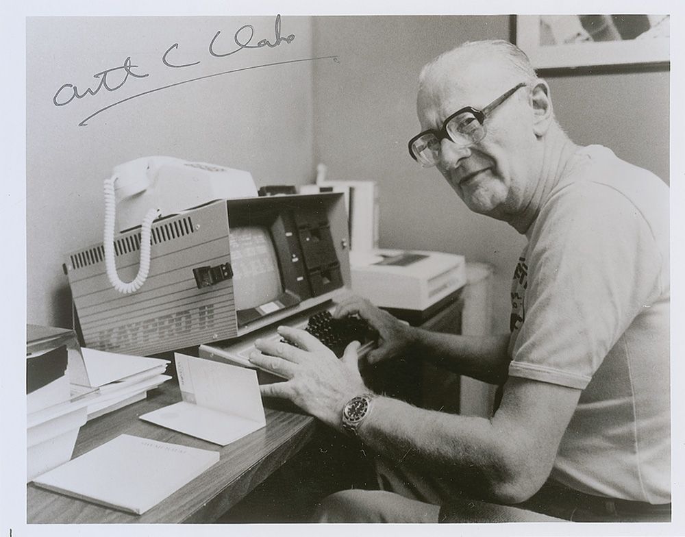 Glossy 10 x 8 photo of the sci-fi writer at an early computer, signed in silver ink, “Arth. C. Clarke.” In fine condition.