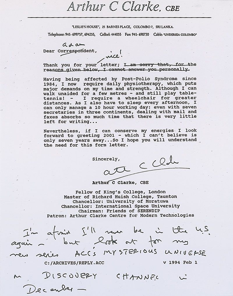 Printed TLS, signed and annotated in ink by Clarke, one page, 8.25 x 11.75, February 1, 1994. Clarke sends a pre-printed form letter explaining why he no longer answers his mail personally. Suffering from post-polio syndrome since 1984, he goes on to explain that he needs sufficient rest, and that he recently had abdominal surgery. Clarke signs at the conclusion, and handwrites the greeting to Adam. He also adds at the bottom, “I’m afraid I’ll never be in the U. S. again—but look for my new series ACC’s Mysterious Universe on Discovery Channel in December.” In fine condition.