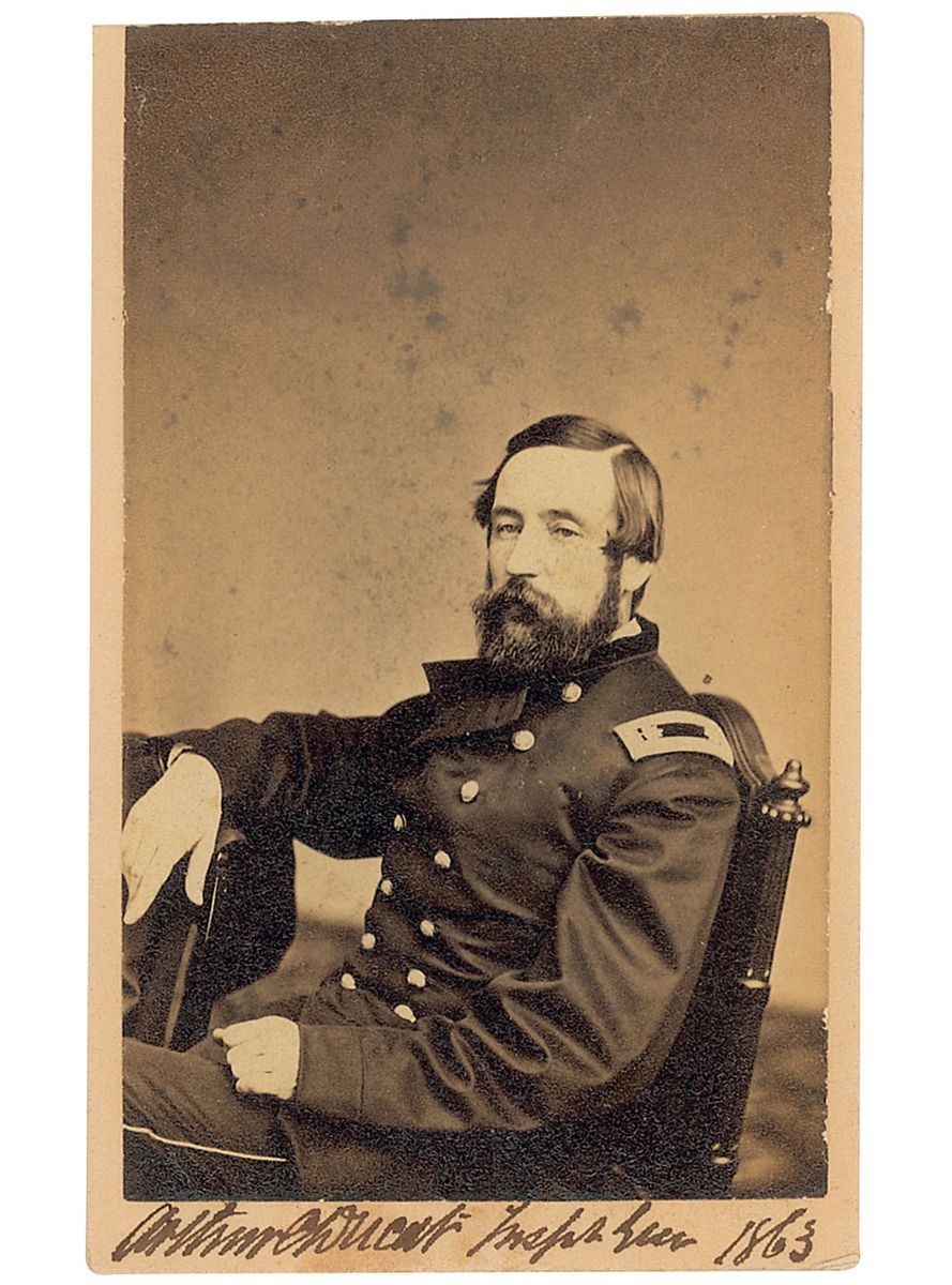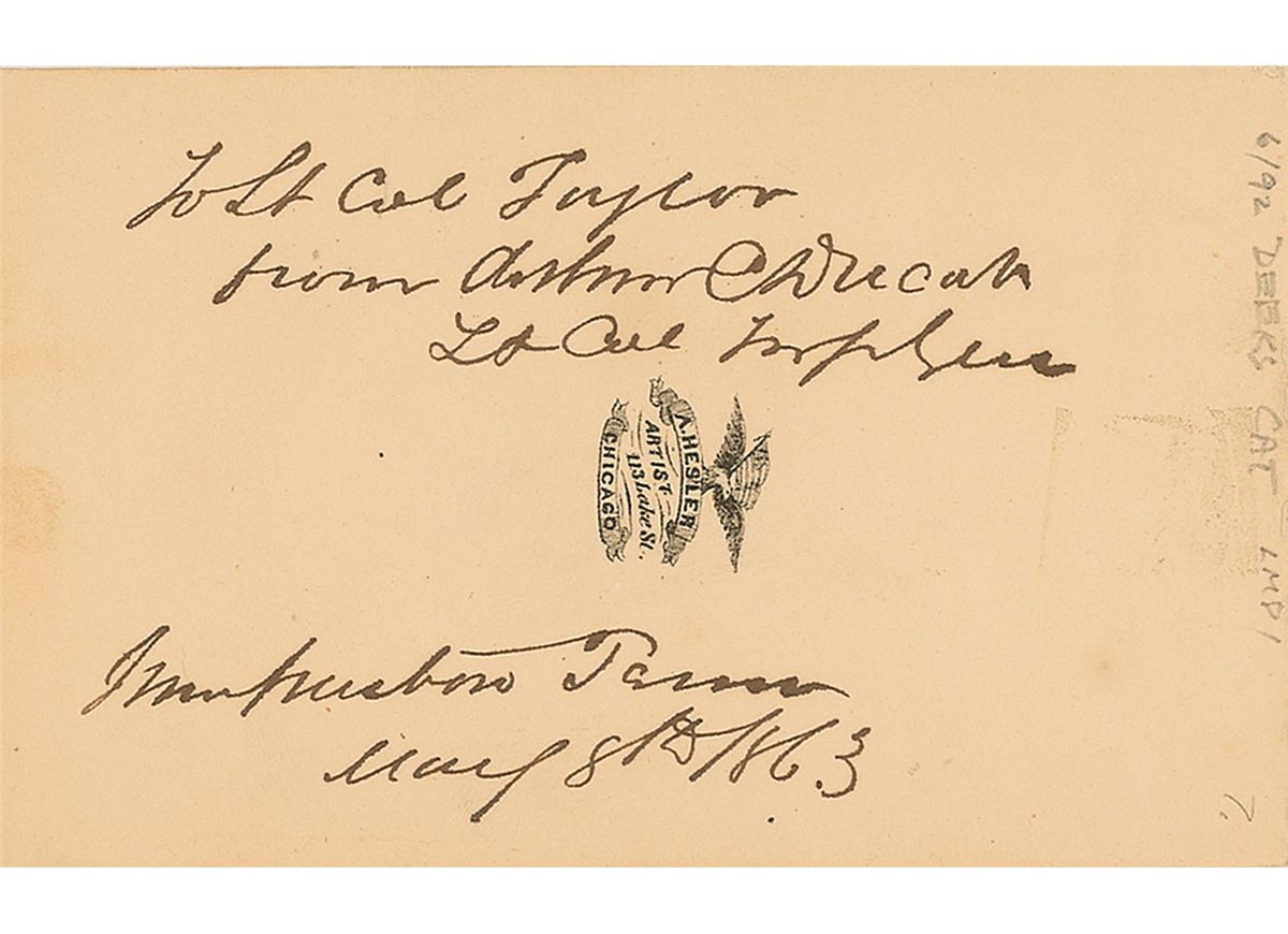 Union officer (1830–1896) in the Civil War who was wounded at the Battle of Fort Donelson. Following the war, he was a leading executive in the insurance industry in Illinois and a world-renowned specialist in fire prevention and protection. Original 2.25 x 3.75 carte-de-visite photo by Hesler of Chicago, signed in the lower border in black ink, “Arthur C. Ducat Insp. Gen 1863,” and signed and inscribed on the reverse, “To Lt. Col Taylor from Arthur C. Ducat, Lt Col. Insp Gen, Mufreesboro, Tennessee, May 8th, 1863.” In fine condition, with a lightly trimmed top edge and some silvering to darker areas of image.