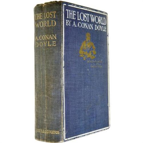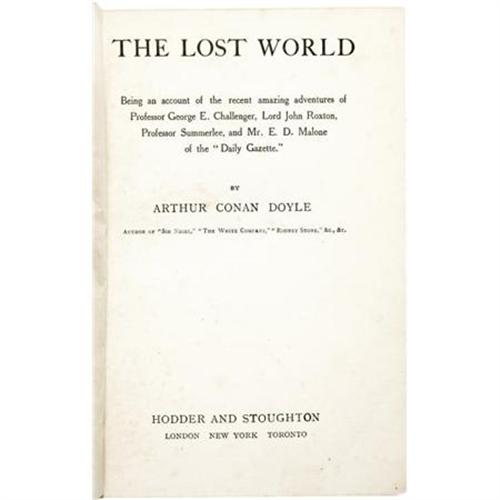 <B>Arthur Conan Doyle: First Edition of <I>The Lost World</B></I></B></I> (London New York Toronto: Hodder and Stoughton, 1912), first edition, 319 pages, blue cloth with white titles and gilt illustration of Challenger on the front board, 12mo (5" x 7.5"), no dust jacket. The first Challenger novel, and Doyle's most famous work after his Sherlock Holmes canon. The book is in about very good condition, with a sunned spine, moderate shelf wear, and foxing to the textblock, mostly confined to the edges and endpapers.<BR><BR><b>Shipping:</b> Books & Catalogs (<a target="_blank" href="http://www.heritageauctions.com/common/shipping.php">view shipping information</a>)