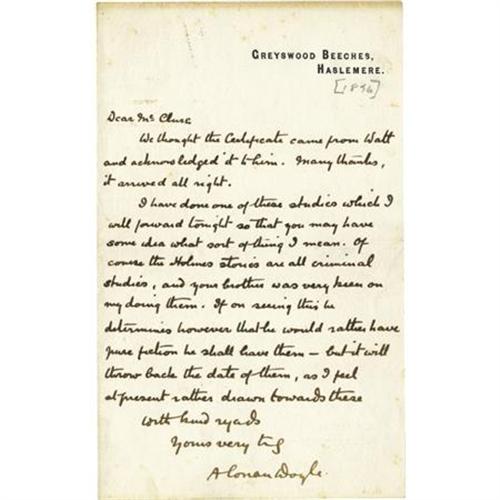 <B>Arthur Conan Doyle Autograph Letter Signed to an Editor at McClure Magazine,</B></I> the magazine that introduced Doyle's work to the United States. Great association and content ALS "<I>A Conan Doyle</B></I>", one page on his Greyswood Beeches, Haslemere stationery, one page, 4.25" x 7", n.d. (but a previous collector has noted 1896 in pencil), thanking the recipient and discussing his plans for writing future stories. <BR><BR>Doyle writes: "<I>We thought the Certificate came from Walt and acknowledged it to him. Many thanks, it arrived all right. I have done one of those studies which I will forward tonight so that you may have some idea what sort of thing I mean. Of course the Holmes stories are all criminal studies, and your brother was very keen on my doing them. If on seeing this he determines however that he would rather have pure fiction he shall have them - but it will throw back the date of them, as I feel at present rather drawn towards these</B></I>" The recipient, addressed simply as "<I>McClure</B></I>", is either Samuel Sidney McClure, or a brother who worked with him at the magazine. McClure was a key figure in publishing in the late 19th Century. His magazine, <I>McClure,</B></I> filled an important niche in the literary world and often syndicated novels-in-progress by such noted authors as Mark Twain, Rudyard Kipling, and Robert Louis Stevenson. Although the magazine would later be remembered most for giving birth to muckraking journalism, its true origin was to promote thought-provoking literature and political essays. <BR><BR>Doyle, a doctor by training, turned to writing short stories during long lulls while waiting for patients. The great success of the Sherlock Holmes series never sat well with him, and in December of 1893 he wrote the death of his famous detective; Holmes and his arch nemesis Moriarty plunged to their deaths in the story "The Final Problem". Doyle always believed his Holmes short stories were folly, and resented that they took time away from more serious scholarship. However public outcry demanded that his fictional hero be brought back to life. To couch the stories as criminal studies made their prospect more bearable to Doyle. And in several instances, his brilliant logic and deducting skills saved a few innocents that had been wrongly accused, most notably in the case of Oscar Slater. The inconsistencies in the case provoked Doyle's curiosity, and his investigations would eventually prove Slater innocent. Letters by Doyle mentioning his great literary creation are very rare, and one citing his desire to focus on them would be most desirable. The letter is quite clean with bold ink and in near fine condition, save a thin band of discoloration at top and a paper-clip mark.<BR><BR><b>Shipping:</b> Flat Material, Small (<a target="_blank" href="http://www.heritageauctions.com/common/shipping.php">view shipping information</a>)