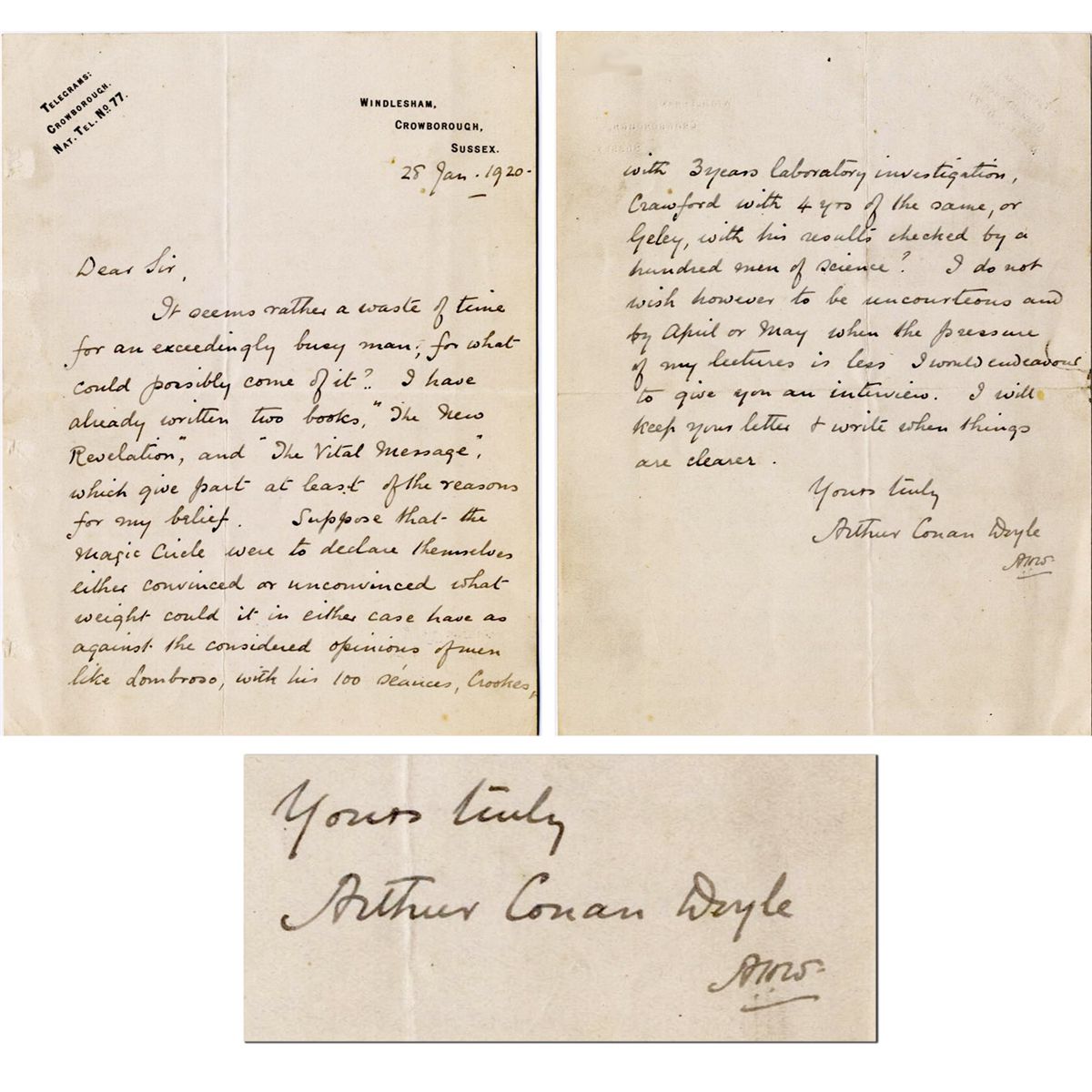 Arthur Conan Doyle autograph letter signed dated 28 January 1920 when Doyle was examining his beliefs on spirituality, a lifelong subject of great interest. Letter to an unnamed recipient reads in part: ''…I have already written two books, 'The New Revelation,' and 'The Vital Message,' which give part…of the reasons for my belief. Suppose that the Magic Circle…'' continuing with much more content, signed ''Arthur Conan Doyle''. 5'' x 6.75'' 2pp. letter on stationery from Doyle's home address shows minor foxing and toning, else very good.