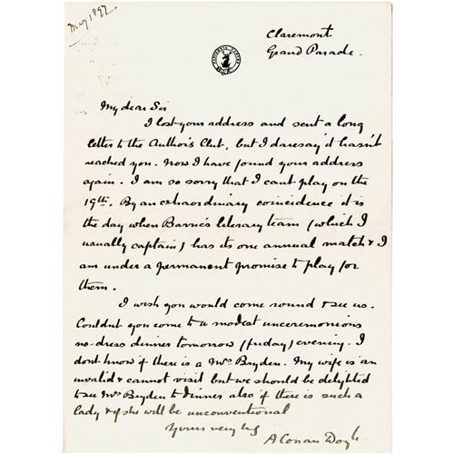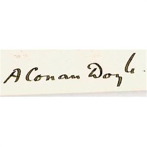 <B>Arthur Conan Doyle Autograph Letter Signed</B></I> "<I>A. Conan Doyle.</B></I>" The rarity and exceptional value of this lot is "Elementary, my dear Watson." Oddly enough, the line quoted above does not appear in any of the Sherlock Holmes books, but only appears later in the movies about the detective. At any rate, this is a fantastic lot for Sherlock Holmes fans. This one page, 4.75" x 6.5," letter written and signed by Doyle, in May of 1897, is to a friend of Doyle's, and reads in part, "<I>I am so sorry that I can't play on the 19th. By an extraordinary coincidence, it is the day when Barnes' literary team (which I usually captain) has its one annual match & I am under permanent promise to play for them…Couldn't you come to a modest unceremonious no-dress dinner tomorrow?</B></I>" The letter is in fine condition, with only slight transference of ink from being folded over the years. <BR><BR>Arthur Conan Doyle's works have been translated into numerous languages, and read all over the world for decades. Every child grows up now knowing about Sherlock Holmes and his penchant for ratiocination and deductive reasoning. Doyle was an amazing man who had many interesting beliefs. It is said that he believed in Fairies, and even wrote several pamphlets explaining why he believed in their existence, he spent over a million dollars supporting these beliefs. <BR><BR>This is a fascinating man who is known, the world over, for a character whose logic and rational thinking are paramount in his personality; conversely, Doyle was a man who believed in the irrational and fanciful. A wonderful dichotomy! A wonderful letter!