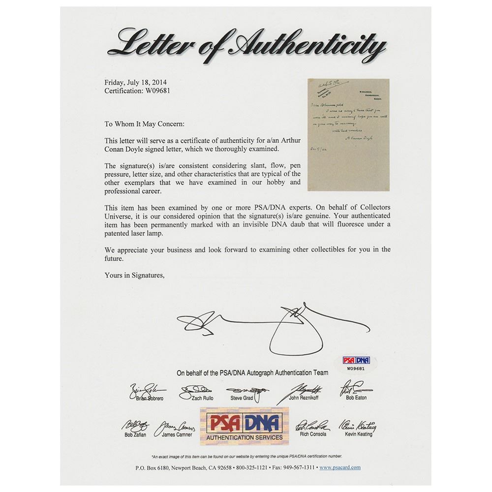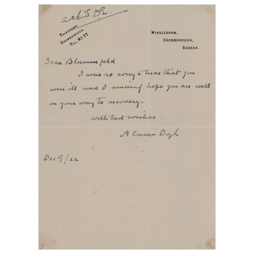 ALS signed "A. Conan Doyle," one page, 5 x 7, personal letterhead, December 9, 1922. Letter to R. D. Blumenfeld, who served as the editor of London's Daily Express newspaper from 1902 to 1932. In full: "I was so sorry to hear that you were ill and I sincerely hope you are well on your way to recovery." In fine condition, with adhesive remnants to the corners. Accompanied by a full letter of authenticity from PSA/DNA.