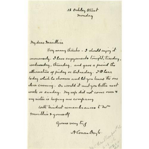 <B>Arthur Conan Doyle: An Extraordinary Manuscript on Spiritualism & an Autograph Letter!</B></I> This lot is comprised of three pieces: a Typewritten Manuscript, bearing copious Autograph corrections and interpolations, an Autograph Letter Signed, and a Typed Letter Signed of Conan Doyle's widow, Jean Conan Doyle. They are, then, as follows: 1) Typed Manuscript, with numerous Autograph additions, deletions and corrections in dark ink, entitled "<I>The Religion of Conan Doyle</B></I>" and being in the form of an interview, 11 pages, 8.5" by 11", no place, no date. Some wear at being handled, else fine. 2) Autograph Letter Signed ("<I>A. Conan Doyle</B></I>"), 1 page, 4/5" by 6.75", 23 Oakley Street, Monday, no month or year; to Marillier. In very fine condition. 3) [Arthur Conan Doyle] Jean Conan Doyle, Typed Letter Signed, 1 page, 7" by 8", Windlesham, Crowborough, Sussex, August 19, 1930. To editor and writer George Sylvester Viereck. Here the least shall go first: the letter of Lady Conan Doyle to Viereck refers to the above described manuscript ("<I>the excellent interview which you published</B></I>") and the recent death of her husband some weeks before. The Conan Doyle A.L.S. concerns his schedule of engagements for the week, and refers to his wife and his sister. Best and last is the manuscript... <BR><BR>Spiritualism became Conan Doyle's religion - and driving force - from World War I on. In this remarkable manuscript, he discusses his personal experience with spirits, Henry Ford, Oscar Wilde and Einstein; of course, such Spiritualist concepts as the soul, reincarnation, telepathy, even the (notoriously fraudulent) Cottingley Fairies come up too. In part, in brief:<I>I [the interviewer] Do you believe in reincarnation like Henry Ford? Doyle: I believe the soul is born and reborn many times. I am not sure that it is dons the human form after it has discarded that garment, but my thoughts incline that way... I: Do you consider Ford a great man? Doyle: He is a great personality. I: Why? Doyle: Because he is uncorrupted by his millions. No man can tell if he is incorruptible until such wealth is thrust upon him... I: Did you have any personal contact with the spiritual world? Doyle: When Geley, the French savant and spiritualist, died I was sitting with a medium in England. Suddenly I heard a whispered word, 'Geley.' I asked, in French, "When you had your accident were the moulds you carried broken?' The answer was 'Oui, Oui, ils etaient casses.' Though the medium did not know a word of French, the spirit communicated through him in that language."... [The interviewer asks about a posthumous book of Oscar Wilde's psychic utterances, Oscar Wilde from Purgatory by Hester Travers-Smith] Doyle: I knew Oscar Wilde when he was living. In that book I recognize poetic and epigrammatic passages which are as characteristic of Wilde as anything that bears his imprint... I: Einstein told me modern mathematicians include in their calculations an infinite number of dimensions. Doyle: Einstein merely expressed what every Spiritualist knows...</B></I>" Covered too are Conan Doyle's thoughts on fairies, marriage, death, the Buddha, Moses, Christ, Mohammed and heaven. A fascinating, heavily marked manuscript! From the Henry E. Luhrs Collection. Accompanied by LOA from PSA/DNA.