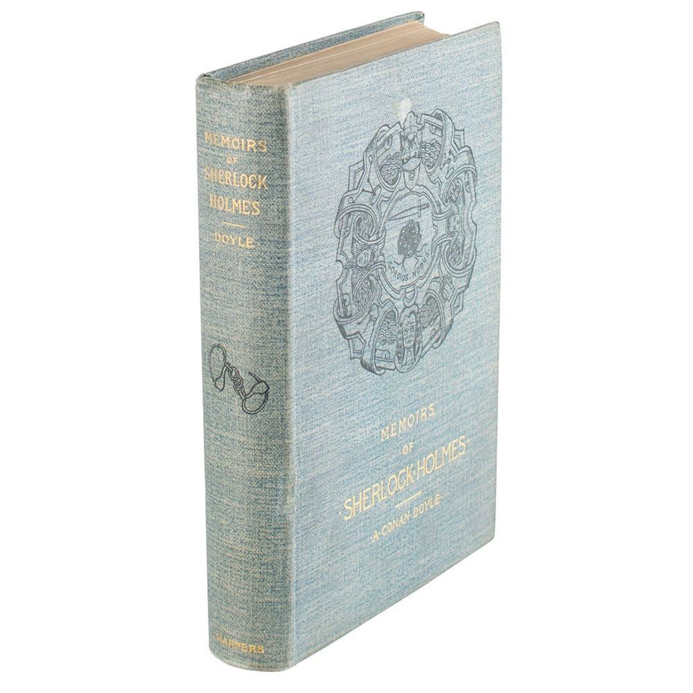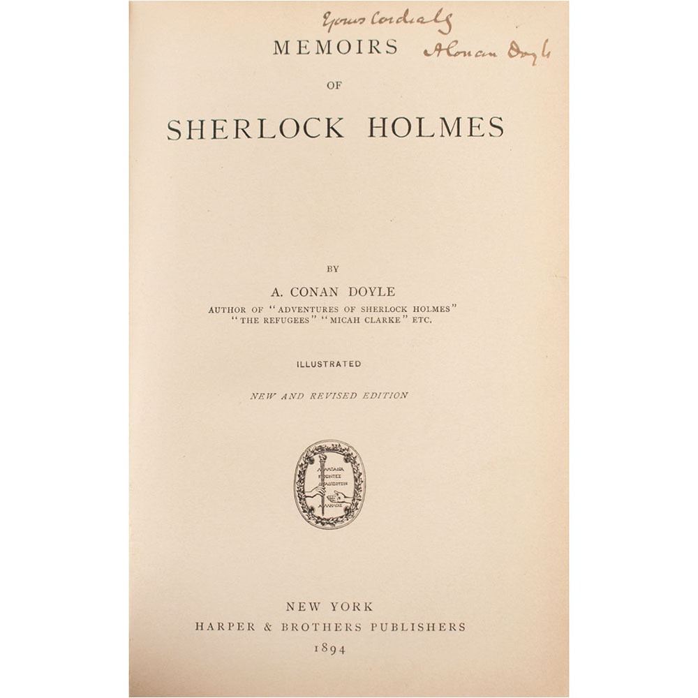 Signed book: Memoirs of Sherlock Holmes. First American edition, second printing. NY: Harper and Brothers, 1894. Hardcover, 5.25 x 7.5, 259 pages. Signed on the title page in ink, "Yours cordially, A. Conan Doyle." Autographic condition: fine, with a tiny edge tear to the signed page. Book condition: VG+/None, with a contemporary ownership inscription to the front pastedown. A rare example of one of Doyle's most popular titles.