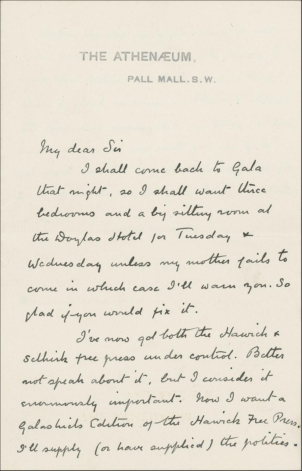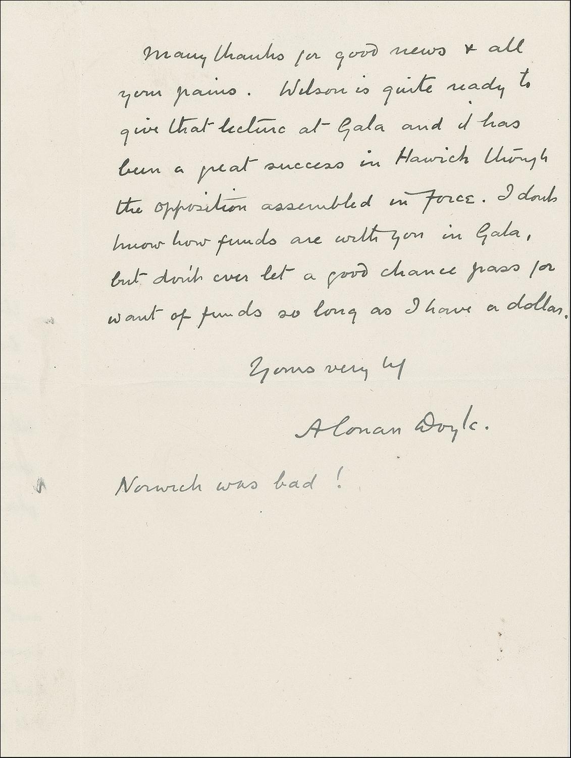 ALS signed “A. Conan Doyle,” two pages on two adjoining sheets, 4.5 x 7, Athenaeum letterhead, no date, but postmarked January 1, 1905. In full, “I shall come back to Gala that night, so I shall want three bedrooms and a big sitting room at the Douglas Hotel for Tuesday and Wednesday unless my mother fails to come in which case I'll warn you. So glad if you would fix it. I've now got both the Hawick & Selkirk free press under control. Better not speak about it, but I consider it enormously important. Now I want a Galashids Edition of the Hawick Free Press. I'll supply (or have supplied) the politics. Many thanks for good news & all your pains. Wilson is quite ready to give that lecture at gala and it has been a great success in Hawick though the opposition assembled in force. I don't know how funds are with you in Gala, but don't ever let a good chance pass for want of funds so long as I have a dollar.” After his signature, Doyle adds “Norwich was bad!” In fine condition, with a central horizontal mailing fold. Accompanied by the original mailing envelope, hand-addressed by Doyle.