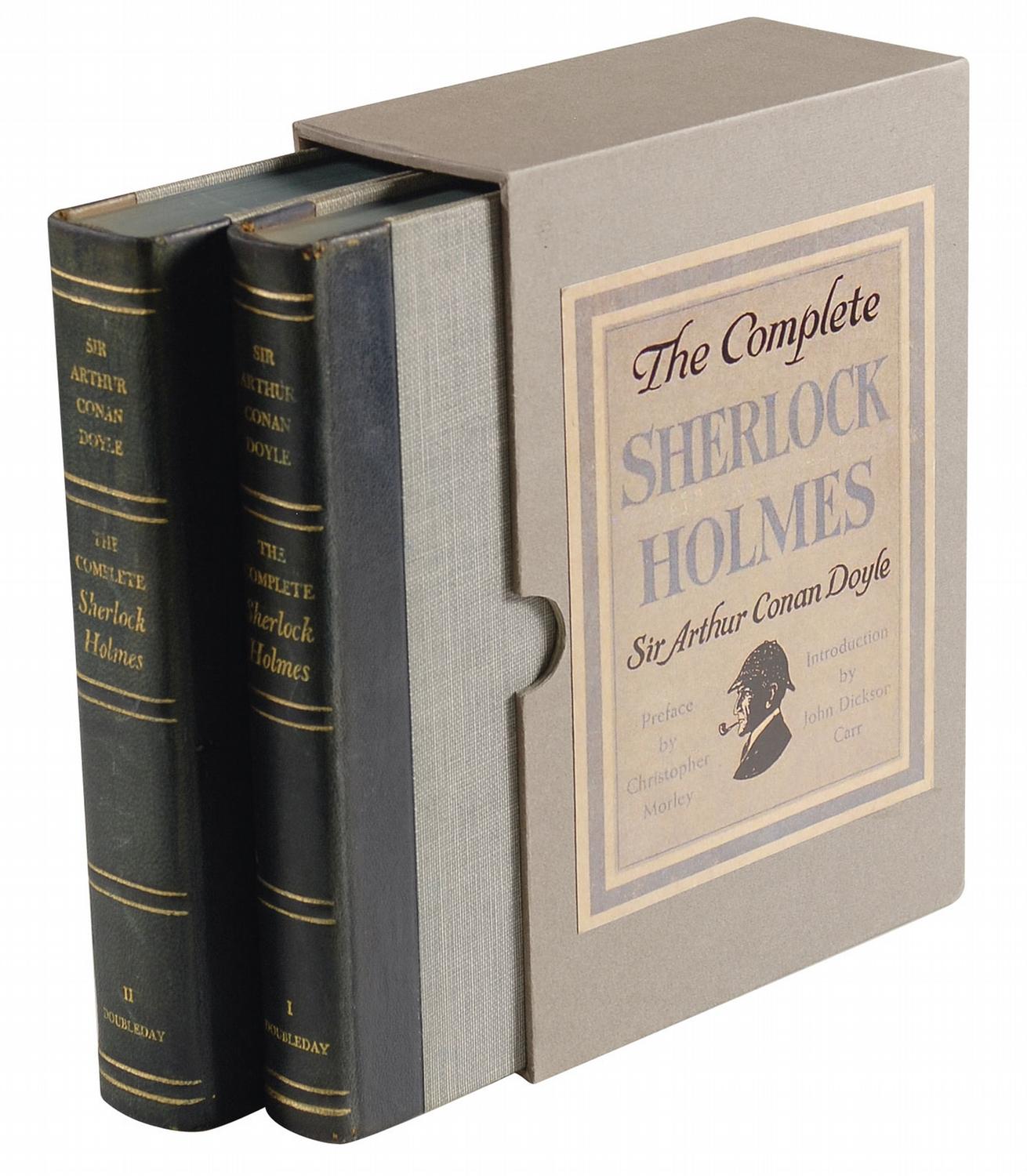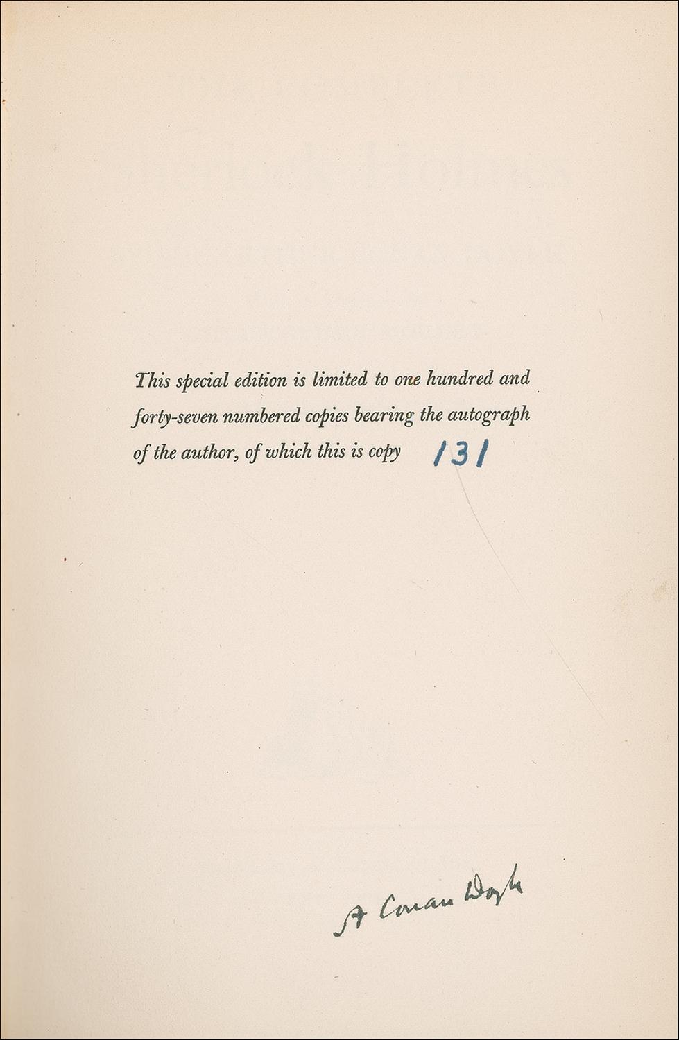 Signed book: The Complete Sherlock Holmes Volumes I and II. Limited edition of 147 copies (this being No. 131. NY: Doubleday, 1953. Hardcover with slipcase, 5.75 x 8.5, 1323 total pages. Signed on the tipped in limitations page in black ink, “A. Conan Doyle.” In fine condition, with a bit of mild toning to top edges, and mild wear, sunning and rubbing to spines. It is unknown for what edition the present limitation leaf was first intended, but they are apparently all found in this 1953 set. The leaves were presumably generated c. 1928-30 when Doubleday was negotiating other signed editions of Doyle, but set aside after the poor sales of the Crowborough Edition and finally salvaged 20 years later. A well-preserved example of Doyle and his most famous character