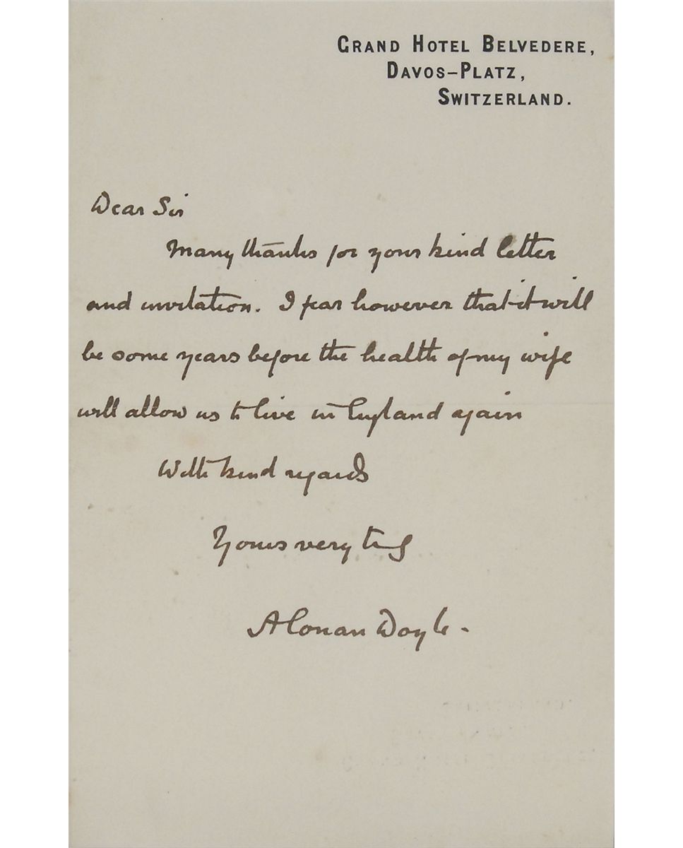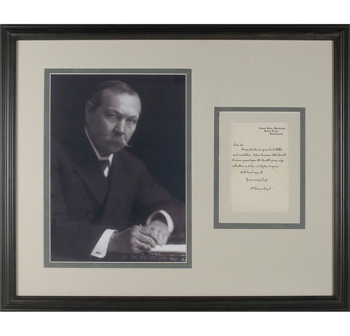 ALS signed “A. Conan Doyle,” one page, 4.25 x 6.5, Grand Hotel Belvedere, Switzerland letterhead, no date. Letter to an unidentified gentleman. In full: “Many thanks for your kind letter and invitation. I fear however that it will be some years before the health of my wife will allow us to live in England again.” Triple-matted and framed to an overall size of 26.25 x 21.5. In fine condition, with some light mirroring of letterhead and ink from folding. In 1893, Doyle’s wife Louise was diagnosed with tuberculosis and given only months to live. Hearing that the climate in Switzerland proved beneficial for others suffering from the ailment, they moved to the country later in the year. Although the climate did not cure her, it helped Louise immensely, and she lived until 1906. Oversized.