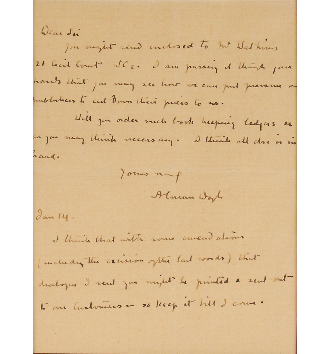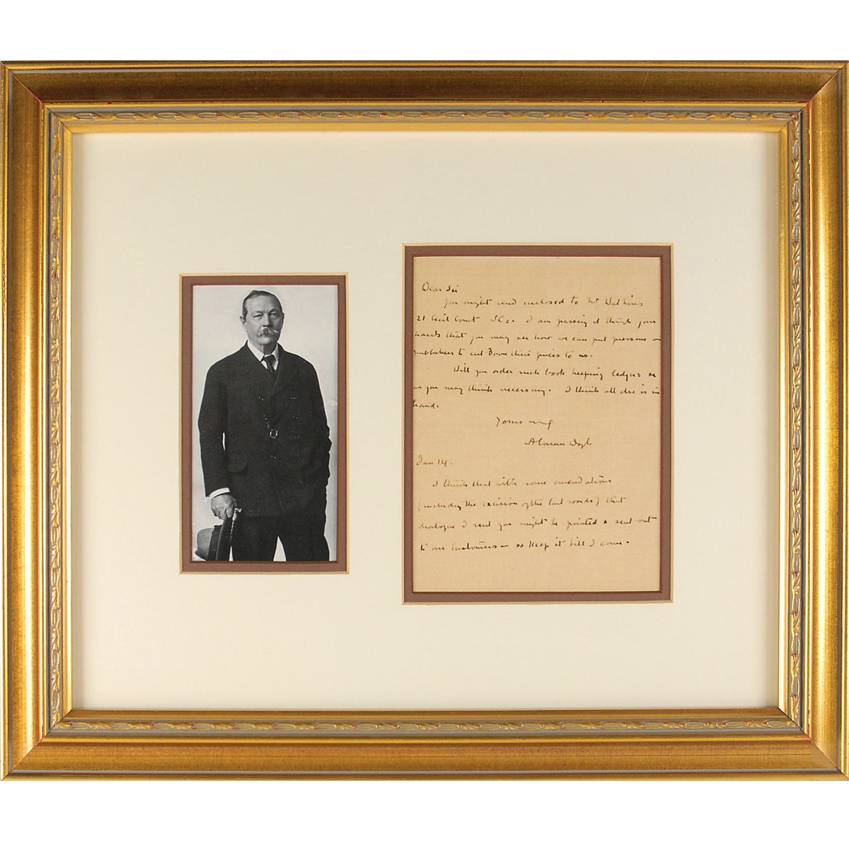 ALS signed “A. Conan Doyle,” one page, 4.75 x 6.5, January 14, no year. In part: “You might send enclosed to Mr. Watkins…I am passing it through your hands that you may see how we can put pressure on publishers to cut down their prices to us. Will you order such bookkeeping ledgers as you may think necessary…I think with some emendations (including the excision of the last words) that dialogue I sent you might be printed and sent out to our customers.” Archivally double-matted and framed with a portrait of the author to an overall size of 16.5 x 14. In fine condition, with uniform toning.
