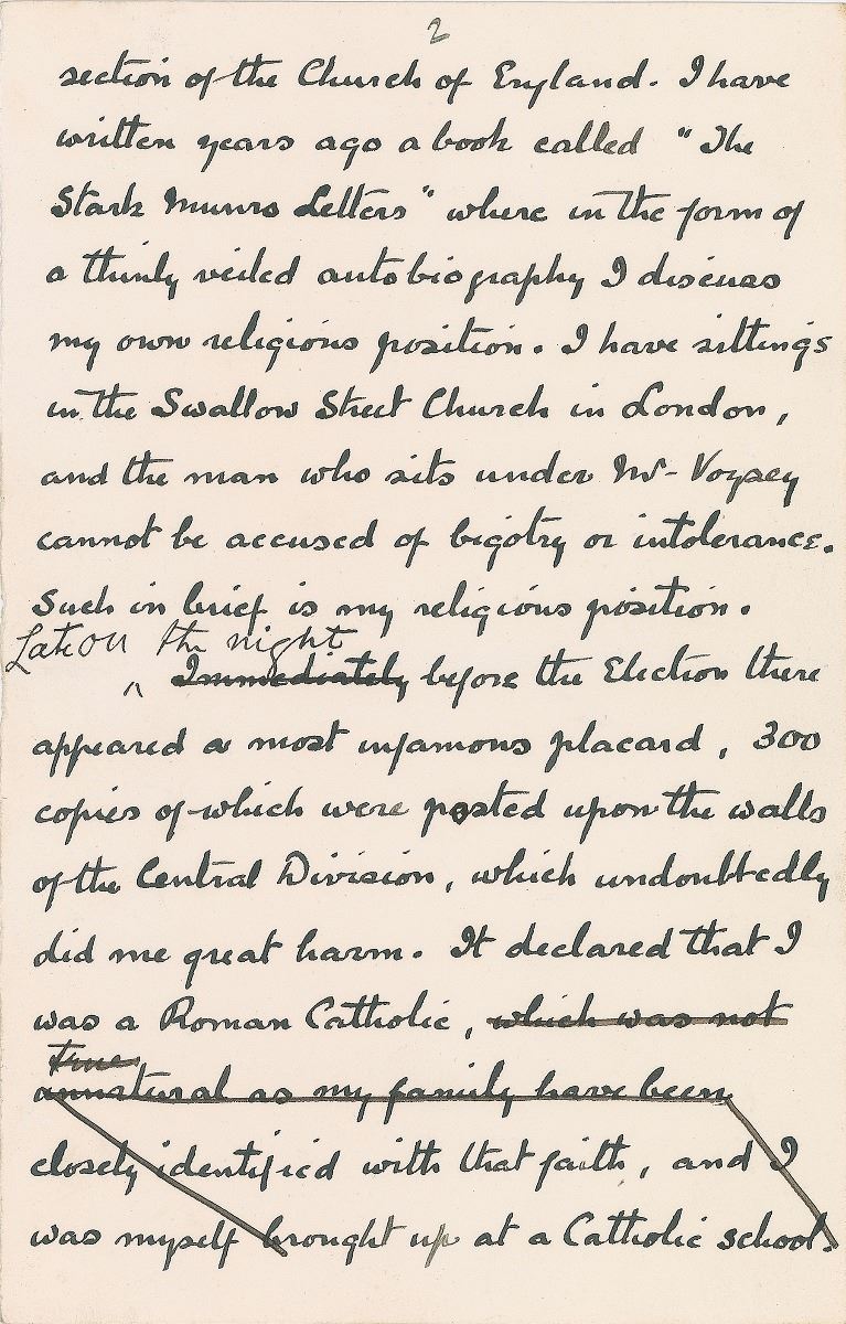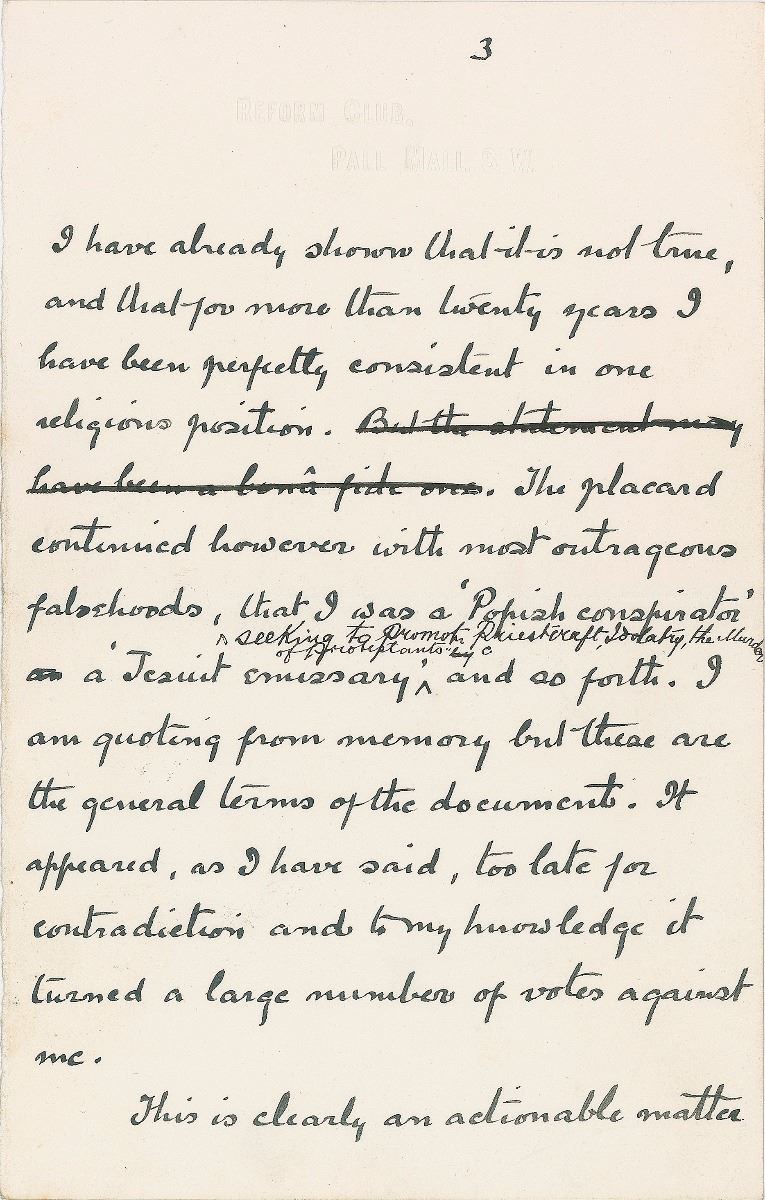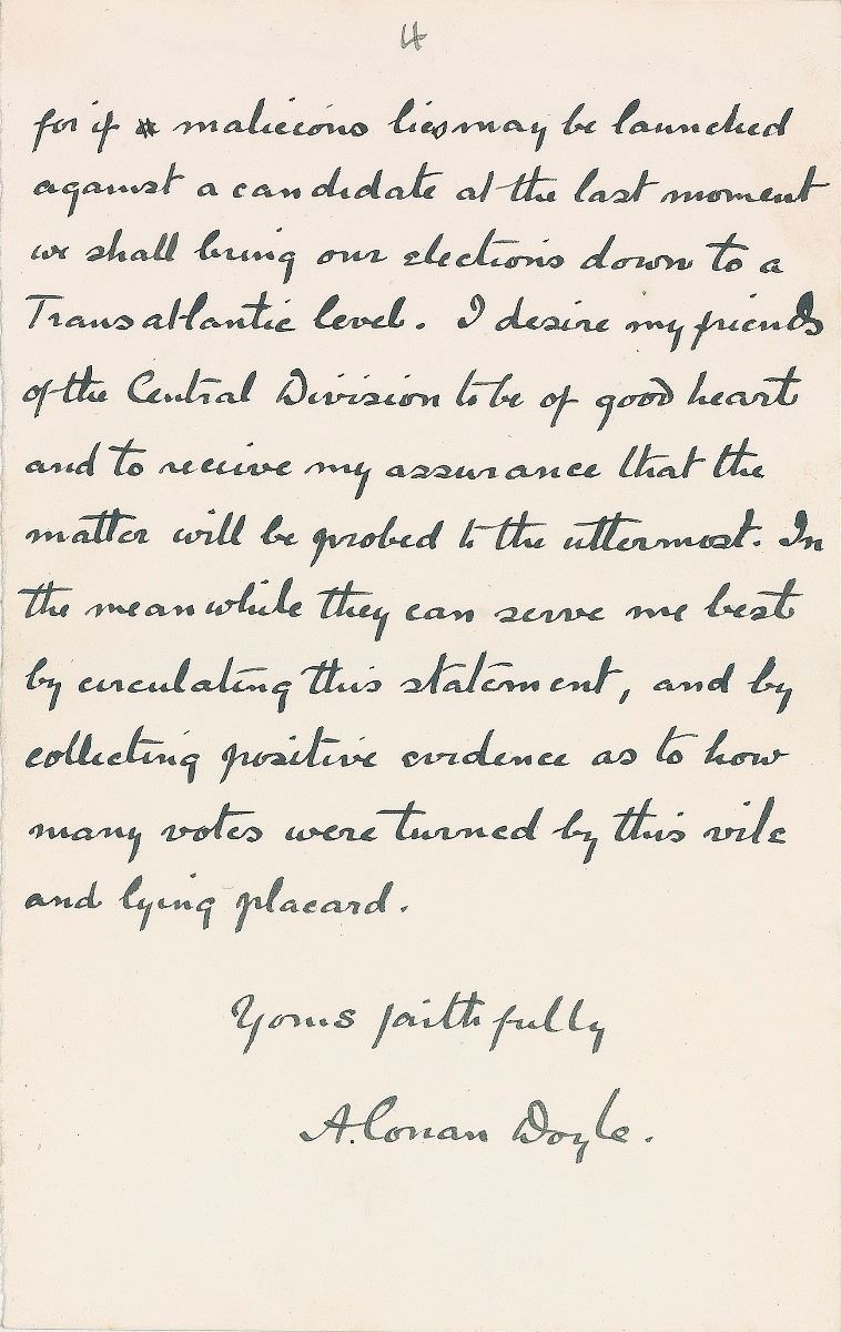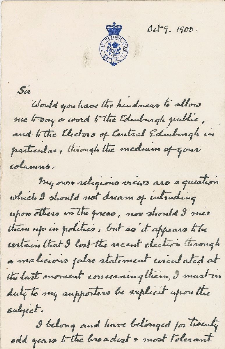 ALS signed “A. Conan Doyle,” four pages, 4.5 x 7, The Reform Club letterhead, October 9, 1900. Letter to the editor of The Scotsman newspaper, in part: “Would you have the kindness to allow me to say a word to the Edinburgh public, and to the Electors of Central Edinburgh in particular, through the medium of your columns. My own religious views are a question which I should not dream of intruding upon others on the press, nor should I mix them up in politics, but as it appears to be certain that I lost the recent election through a malicious false statement circulated at the last moment concerning them, I must in duty to my supporters be explicit upon the subject. I belong and have belonged for twenty odd years to the broadest & most tolerant section of the Church of England. I have written years ago a book called ‘The Stark Munro Letters’ where in the form of a thinly veiled autobiography I discard my own religious position. I have sittings in the Swallow Street Church in London, and the man who sits under Mr. Voysey cannot be accused of bigotry or intolerance. Such in brief is my religious position. Late on the night before the Election there appeared a most infamous placard, 300 copies of which were posted upon the walls of the Central Division, which undoubtedly did me great harm. It declared that I was a Roman Catholic [which was not true, unnatural as my family have been closely identified with that faith, and I was myself brought up at a Catholic school.] I have already shown that it is not true, and that for more than twenty years I have been perfectly consistent in one religious position [But the statement may have been a bona fide…] The placard continued however with most outrageous falsehoods, that I was a ‘Popish conspirator a ‘Jesuit emissary’ seeking to promote Priestcraft, Idolatry, the Murder of the Protestants, and so forth. I am quoting from memory but these are the general terms of the document. It appeared, as I have said, too late for contradiction and to my knowledge it turned a large number of votes against me. This is clearly an actionable matter for if malicious lies may be launched against a candidate at the last moment we shall bring our elections down to a Transatlantic level. I desire my friends of the Central Division to be of good heart and to receive my assurance that the matter will be probed to the uttermost. In the meanwhile they can serve me best by circulating this statement, and by collecting positive evidence as to how many votes were turned by this vile and lying placard.” Doyle has made a number of strikethroughs and handwritten emendations. In fine condition.