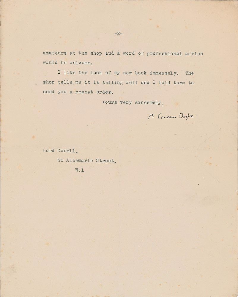 TLS signed “A. Conan Doyle,” two pages, 8 x 10, Windlesham letterhead, June 25, 1930. Letter to Lord Gorell, in part: "As you know we, the Psychic Bookshop, publish a few books and we have two in the press at present. One, 'The Consoling Angel,' a very remarkable case of evidential identity and the other Mrs. Hinchcliffe's narrative as to her husband's return, also a most evidential document. Here is good stuff, well printed and got up, but there is always the one fatal link in my chain that I have no means of putting it before the booksellers. So small a business with so limited an output cannot afford a staff of travellers. I advertise but with the limited circulation such books have, the advertising must also be limited. Could you suggest ay means by which I could get these books on the counters of booksellers? We are amateurs at the shop and a world of professional advice would be welcome. I like the look of my new book immensely. The shop tells me it is selling well and I told them to send you a repeat order." In fine condition, with intersecting folds and faint foxing. For many of his later years, Doyle intensely pursued his interest in paranormal phenomena, and by the end of World War I he identified himself as a spiritualist, believing in a spirit world and the ability to communicate with those beyond the grave. He established the specialized Psychic Bookshop in 1925, devoted entirely to the sale of spiritualistic and psychic books; he later formed a small museum in the basement, showcasing various objects relevant to ghosts and the spirit world. An intriguing letter associated with Doyle's paranormal pursuits.