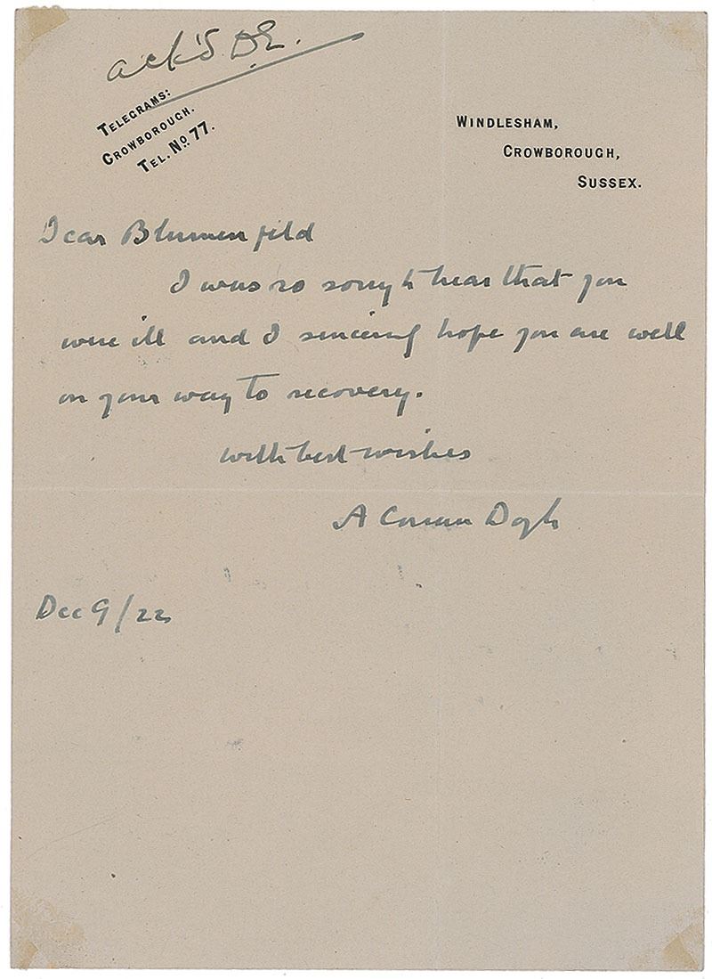 ALS signed "A. Conan Doyle," one page, 5 x 7, personal letterhead, December 9, 1922. Letter to R. D. Blumenfeld, who served as the editor of London's Daily Express newspaper from 1902 to 1932. In full: "I was so sorry to hear that you were ill and I sincerely hope you are well on your way to recovery." In fine condition, with adhesive remnants to the corners.
