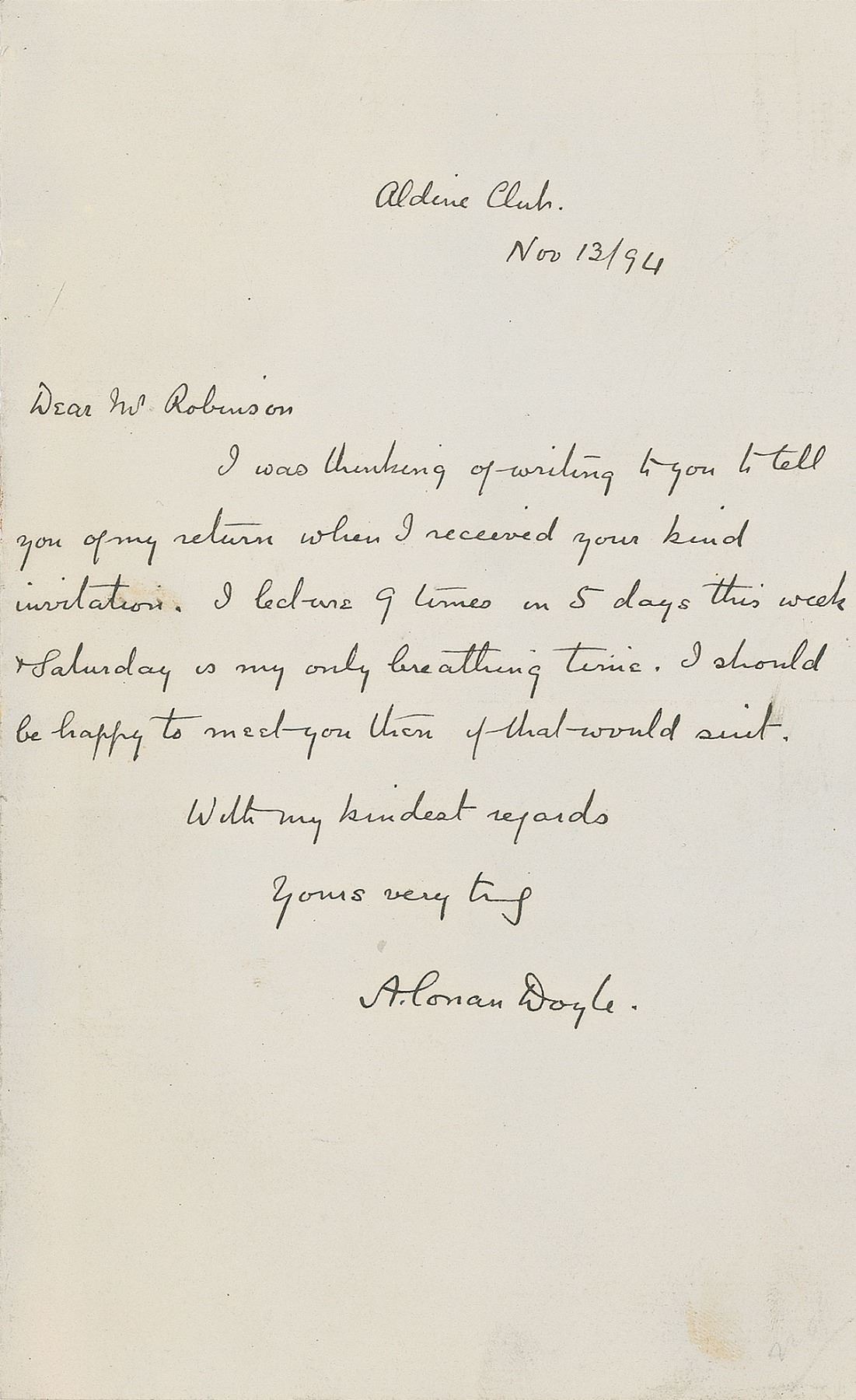 ALS signed “A. Conan Doyle,” one page, 4.75 x 7.75, November 13, 1894. Written from the Aldine Club, a letter to Mr. Robinson, ostensibly his friend Bertram Fletcher Robinson, in full: "I was thinking of writing to you to tell you of my return when I received your kind invitation. I lecture 9 times in 5 days this week & Saturday is my only breathing time. I should be happy to meet you then if that would suit." In fine condition, with some light creasing. Accompanied by a full letter of authenticity from JSA.