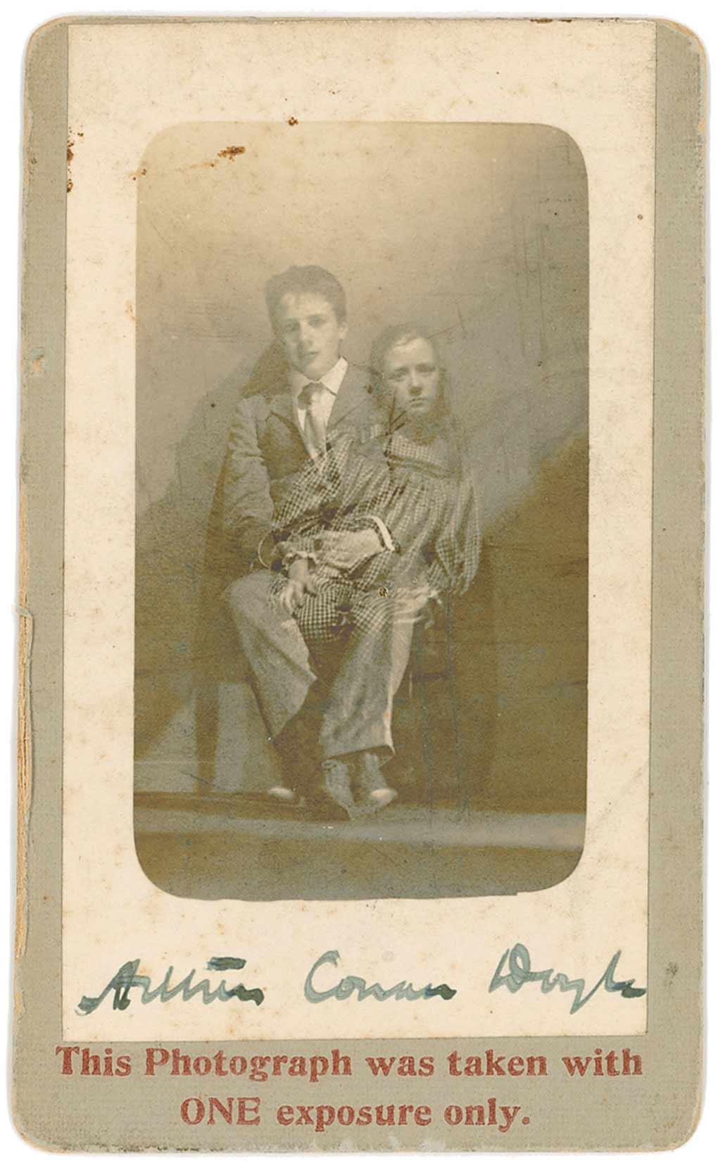Vintage 2.5 x 4.25 single exposure ‘spirit’ photo, bearing a printed caption at the bottom reading, “This photograph was taken with ONE Exposure only.” The image, purported to be the ghost of a young girl sitting in the lap of a young man, has been signed at the bottom of the image in-full by Doyle. In fine condition, with a bit of light silvering to image, and a bit of light curling to the edges.