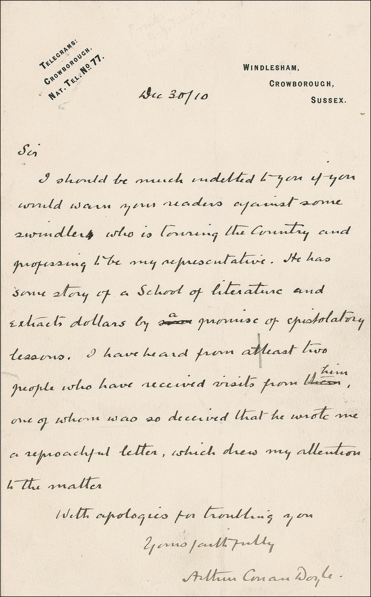 ALS, one page, 5 x 8, personal letterhead, December 30, 1910. Letter to an unidentified gentleman. In full: “I should be much indebted to you if you would warn your readers against some swindler who is touring the Country and professing to be my representative. He has some story of a School of literature and extracts dollars by a promise of epistolatory lessons. I have heard from at least two people who have received visits from him, one of whom was so deceived that he wrote me a reproachful letter, which drew my attention to the matter.” In fine condition, with small tear and staple hole to top edge, and a vertical fold through a single letter of signature.