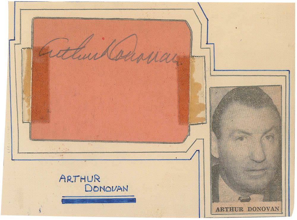 Boxing Hall of Famer (1891–1980) who refereed fourteen heavyweight championship fights from 1933 to 1946. Vintage pencil signature, “Arthur Donovan,” on the reverse of a salmon-colored 2.75 x 2.25 parking garage ticket. Ticket is affixed to a 5.5 x 4 off-white album page along with a clipped photo of Donovan. Old tape along vertical edges, lightly affecting first and last letters of signature, otherwise fine condition.