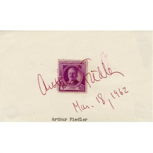 <B>Arthur Fiedler Autograph.</B></I> A 5" x 3" card, with a three-cent postage stamp affixed, signed by the celebrated conductor in red ink. Fiedler's autograph extends across the face of the stamp (featuring conductor Victor Herbert) and is large and fairly clean, though there is a slight smear to Fiedler's signature in right quadrant. In Very Fine condition.<BR><BR><b>Shipping:</b> Flat Material, Small (<a target="_blank" href="http://www.heritageauctions.com/common/shipping.php">view shipping information</a>)
