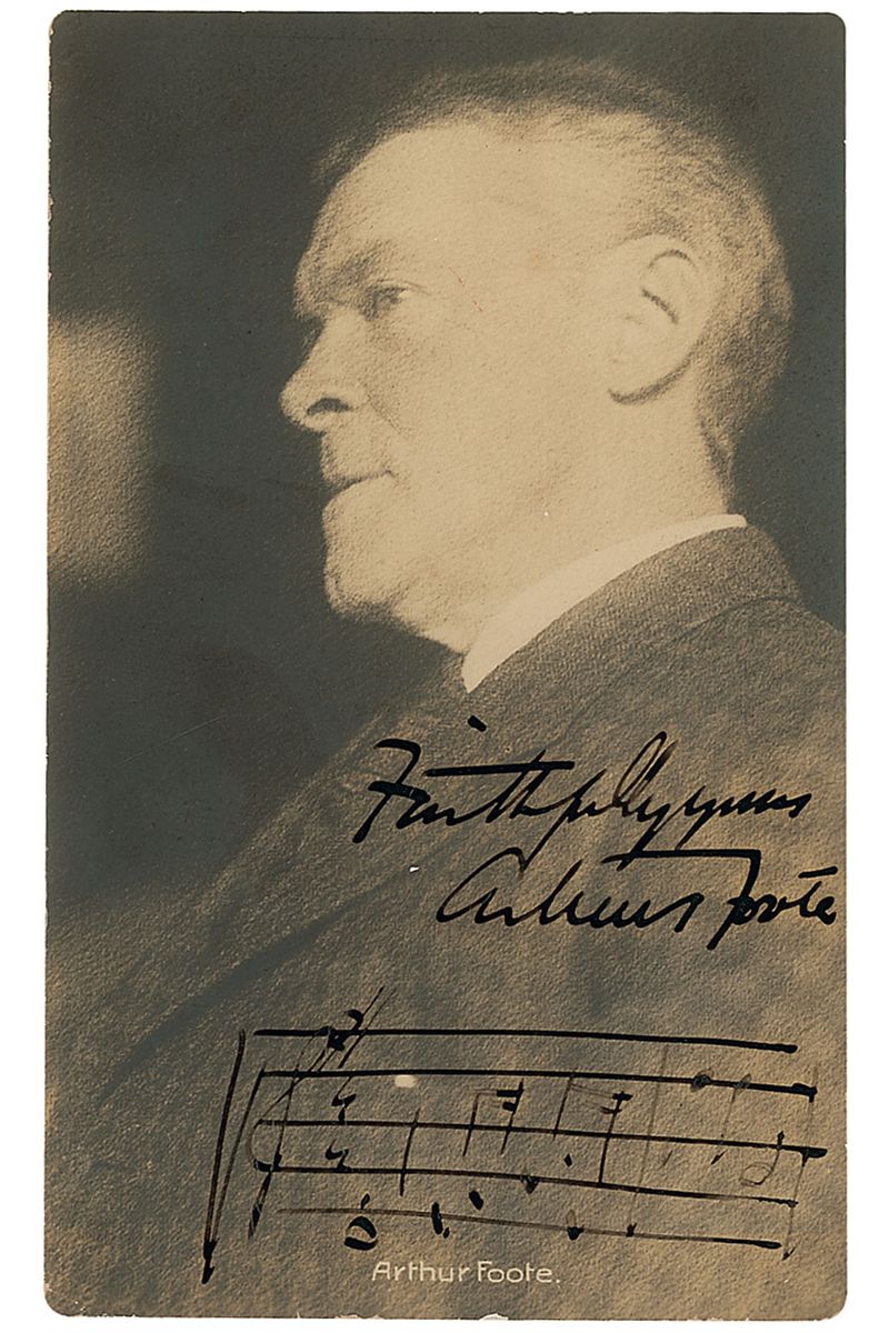 Influential American classical composer best known as a member of the ‘Boston Six’ (1853–1937). Vintage 3.25 x 5.25 real photo postcard of Foote in profile, boldly signed in fountain pen, “Faithfully yours, Arthur Foote,” above a two-bar AMQS. Light scattered surface creases and silvering to dark areas of the image, otherwise fine condition.
