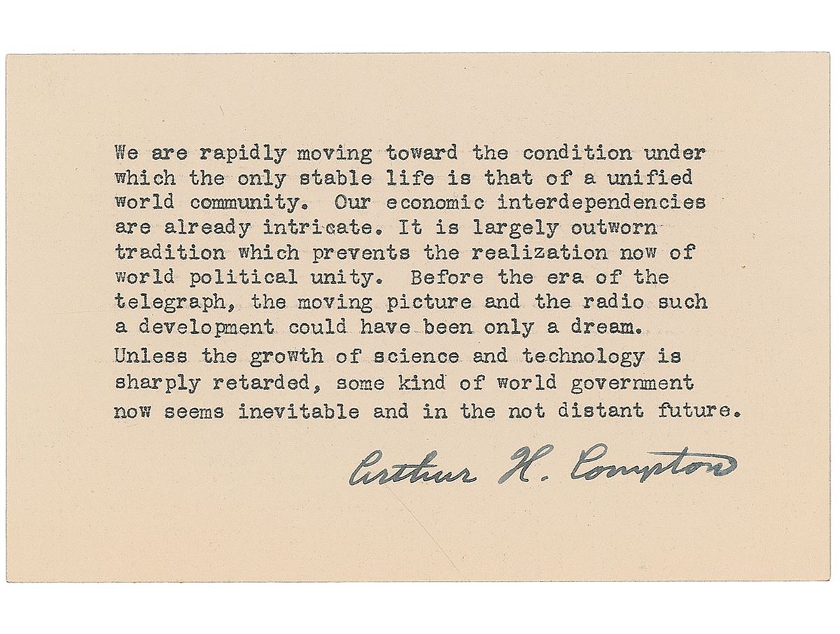 American physicist (1892–1962) who won the Nobel Prize in Physics in 1927 for his discovery of the Compton effect. TQS on an off-white 5.5 x 3.5 card, signed in fountain pen. Quote reads, in full: “We are rapidly moving toward the condition under which the only stable life is that of a unified world community. Our economic interdependencies are already intricate. It is largely outworn tradition which prevails the realization now of world political unity. Before the era of the telegraph, the moving picture and the radio such a development could have been only a dream. Unless the growth of science and technology is sharply retarded, some kind of world government now seems inevitable and in the not distant future.” In fine condition.