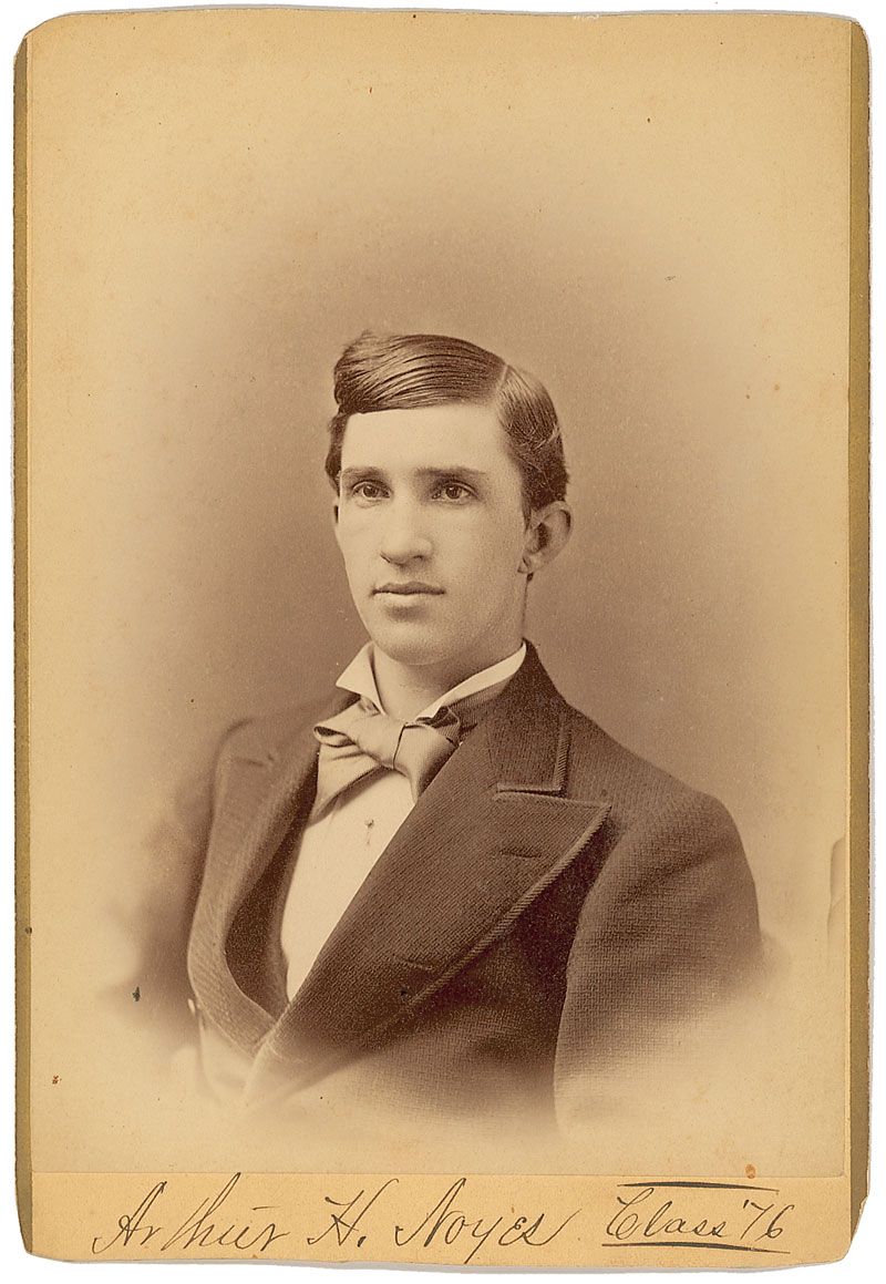 Federal Judge in Nome, Alaska, appointed in 1900. He soon set up a plot to grab all the gold mining claims:, by the time his plan was discovered, he vanished with $30,000 worth of gold, never to be seen again. His scheme was the basis of Rex Beach’s novel, The Spoilers. Vintage 4.25 x 6.25 cabinet photo of a young Noyes by E. R. Curtiss of Madison, Wisconsin, signed in the lower border in black ink, “Arthur H. Noyes, Class ’76.” In fine condition, with slightly trimmed horizontal edges.