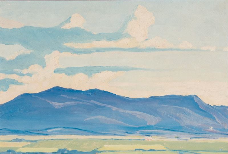 To the unaided eye, this piece appears to be in very good condition. Inspection under ultraviolet light reveals a normal fluorescence of the artist's pigments. There are no signs of damage or restoration. The piece is framed in a semi-ornate pale gold and teal frame with a linen liner and an antiqued silver fillet. the frame is in good condition, showing normal signs of wear. Verso: [handwritten on back of panel] Arthur E. Haddock_41 So. Sutter St., Stockton, Calif_ 4 Evening-Southwest across Taos Valley- Mon. Aug, 12 1929_