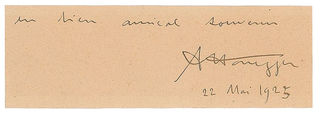Ink signature, "un bien amical souvenir, A. Honegger, 22 Mai 1925,” on an off-white 7 x 2.25 slip. In fine condition.