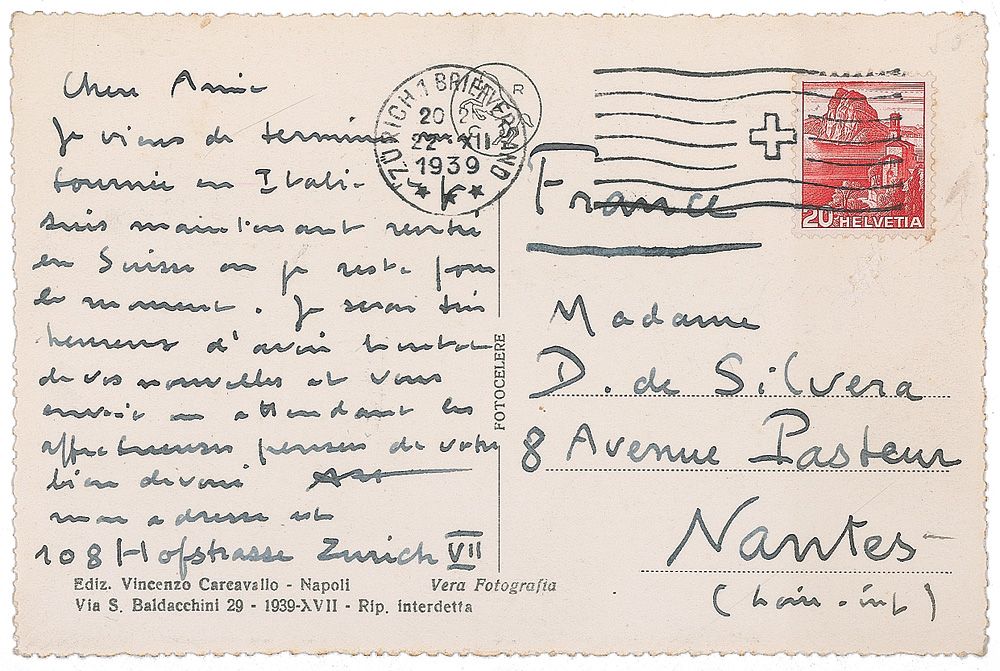 ALS in French, signed “A. H.,” on a 5.5 x 3.5 deckle-edge picture postcard of Napoli, no date, but postmarked Zurich 1939. Postcard to Madame de Silvera stating he has just arrived in Switzerland after a trip through Italy and he is happily looking forward to news from her. In fine condition, with a bit of light toning and surface marks to image side.
