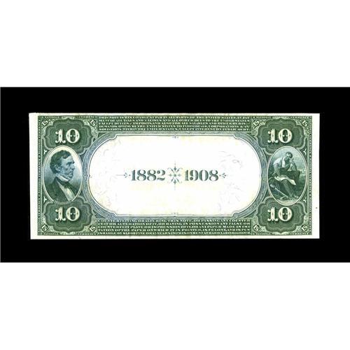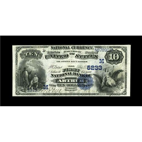 <B>Arthur, IL</B></I> - $10 1882 Date Back Fr. 545 <B>The First NB</B></I> Ch. # (M)5233<This bank was chartered in 1899 and issued until its failure in 1933, leaving a census of just 12 large notes. Prior to the surfacing of this new addition there was only one other $10 1882 Date Back traced from here. This is the second and it is a very nice one, indeed, with just a few subtle folds, more than ample margins and readily legible officers' hand signed signatures. It would be hard to imagine a nicer example ever becoming available from this elusive issuer. <B>Very Fine+.</B></I>