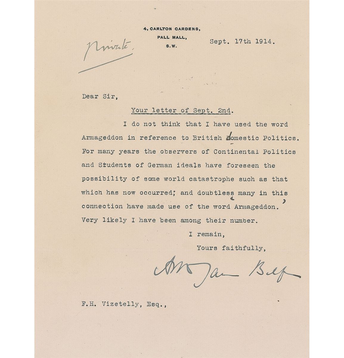 TLS, one page, 6.75 x 8.75, personal letterhead, September 17, 1914. Letter to lexicographer Frank H. Vizetelly. In part: “I do not think that I have used the word Armageddon in reference to British domestic Politics. For many years the observers of Continental Politics and Students of German ideals have foreseen the possibility of some world catastrophe such as that which has now occurred; and doubtless many in this connection have made use of the word ‘Armageddon.’ Very likely I have been among their number.” In fine condition, with unobtrusive staple holes to the top. Although the ‘Armageddon’ refers to the place where the final battle will be fought between the forces of good and evil, as proclaimed in the Bible, it had taken on new meaning with the advent of World War I earlier in 1914. The entry for ‘Armageddon’ in the dictionary released by Funk & Wagnalls, prepared under Vizetelly’s supervision, concludes with, ‘the term has been applied to any great conflict or slaughter.’ It is especially interesting to note that Balfour believed in the Zionist cause of establishing a home for the Jewish people in Palestine, which is where the biblical Armageddon is located; it was World War I that significantly shaped the modern Middle East, with the Balfour Declaration to establish Palestine as a homeland for the Jewish people being incorporated into the Treaty of Sevres at the conclusion of the war. The date of the letter here offered, September 1914, was a particularly dangerous and chaotic time during World War I, as the fighting ramped up into full force with gruesome results.