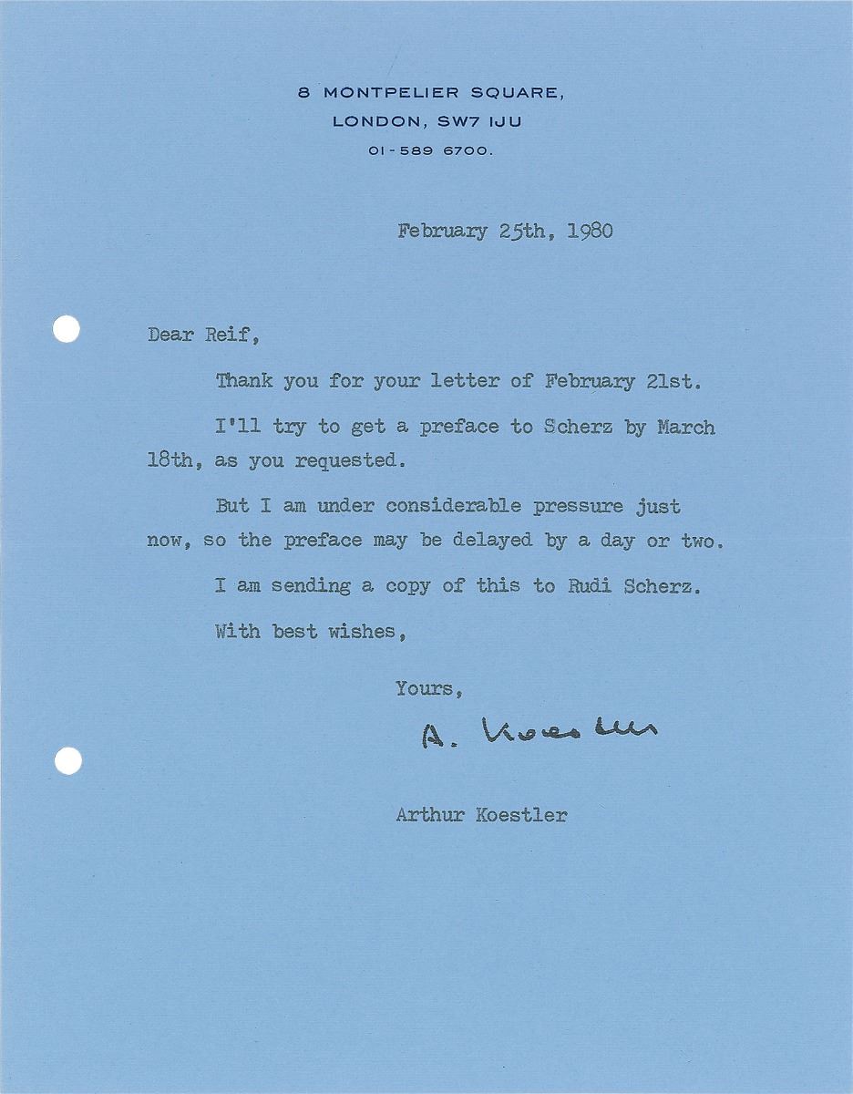 Jewish-Hungarian author (1905–1983) best known for the anti-Stalinist novel Darkness at Noon. TLS signed “A. Koestler,” one page, 6.25 x 8, personal letterhead, February 25, 1980. Letter concerning a preface. In part: “I’ll try to get a preface to Scherz by March 18th…But I am under considerable pressure just now, so the preface might be delayed by a day or two.” In fine condition.