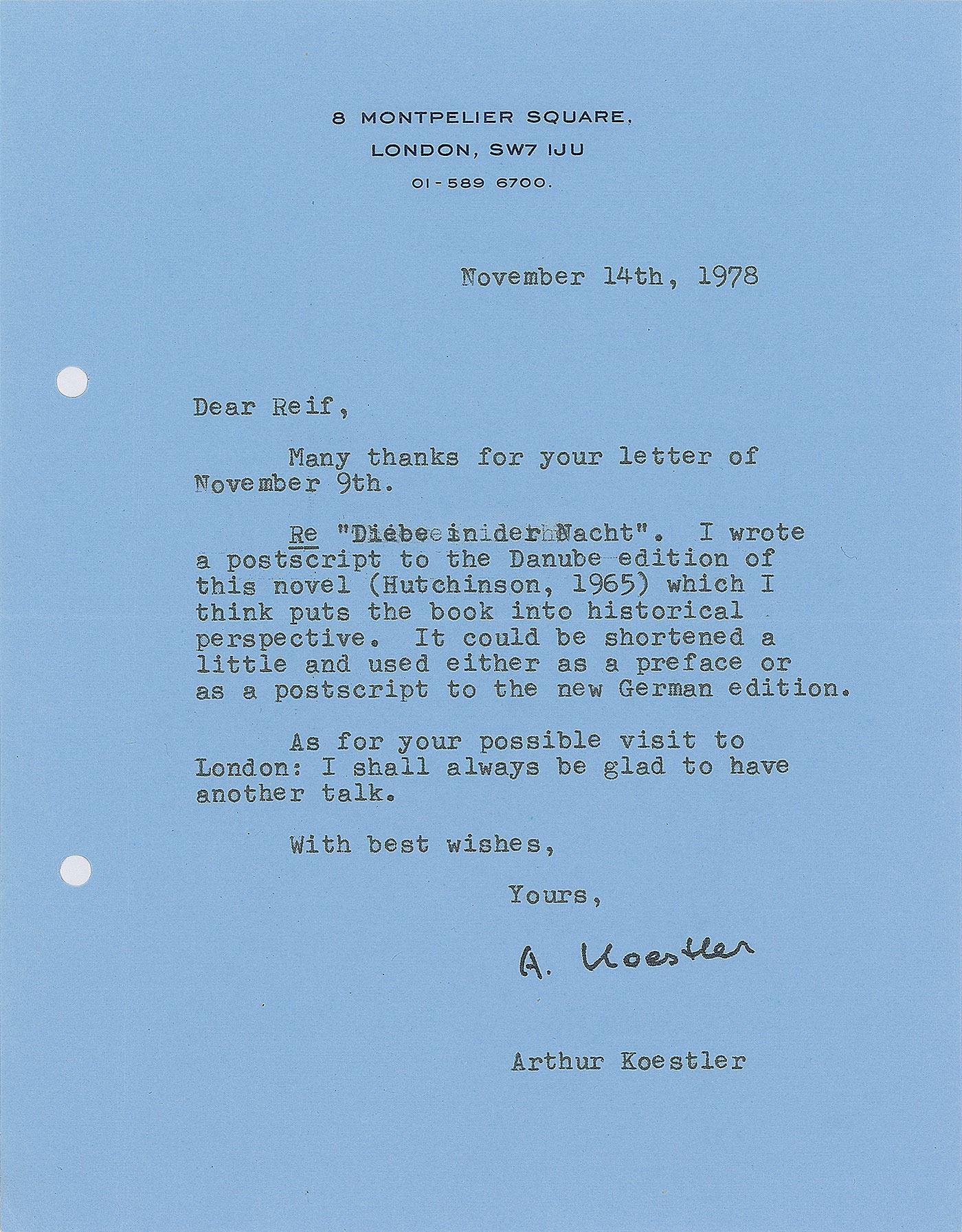 Jewish-Hungarian author (1905–1983) best known for the anti-Stalinist novel Darkness at Noon. TLS signed “A. Koestler,” one page, 6.25 x 8, personal letterhead, November 14, 1978. In part: "Re. 'Diebe in der Nacht [Thieves in the Night].' I wrote a postscript to the Danube edition of this novel (Hutchinson, 1965) which I think puts the book into historical perspective. It could be shortened a little and used either as a preface or as a postscript to the new German edition." In fine condition, with two file holes to the left edge.
