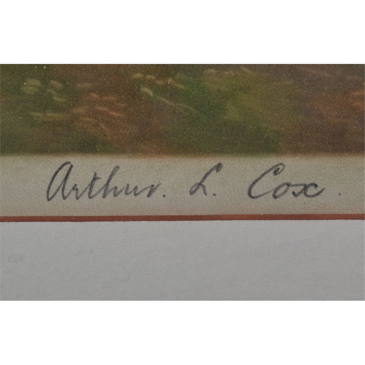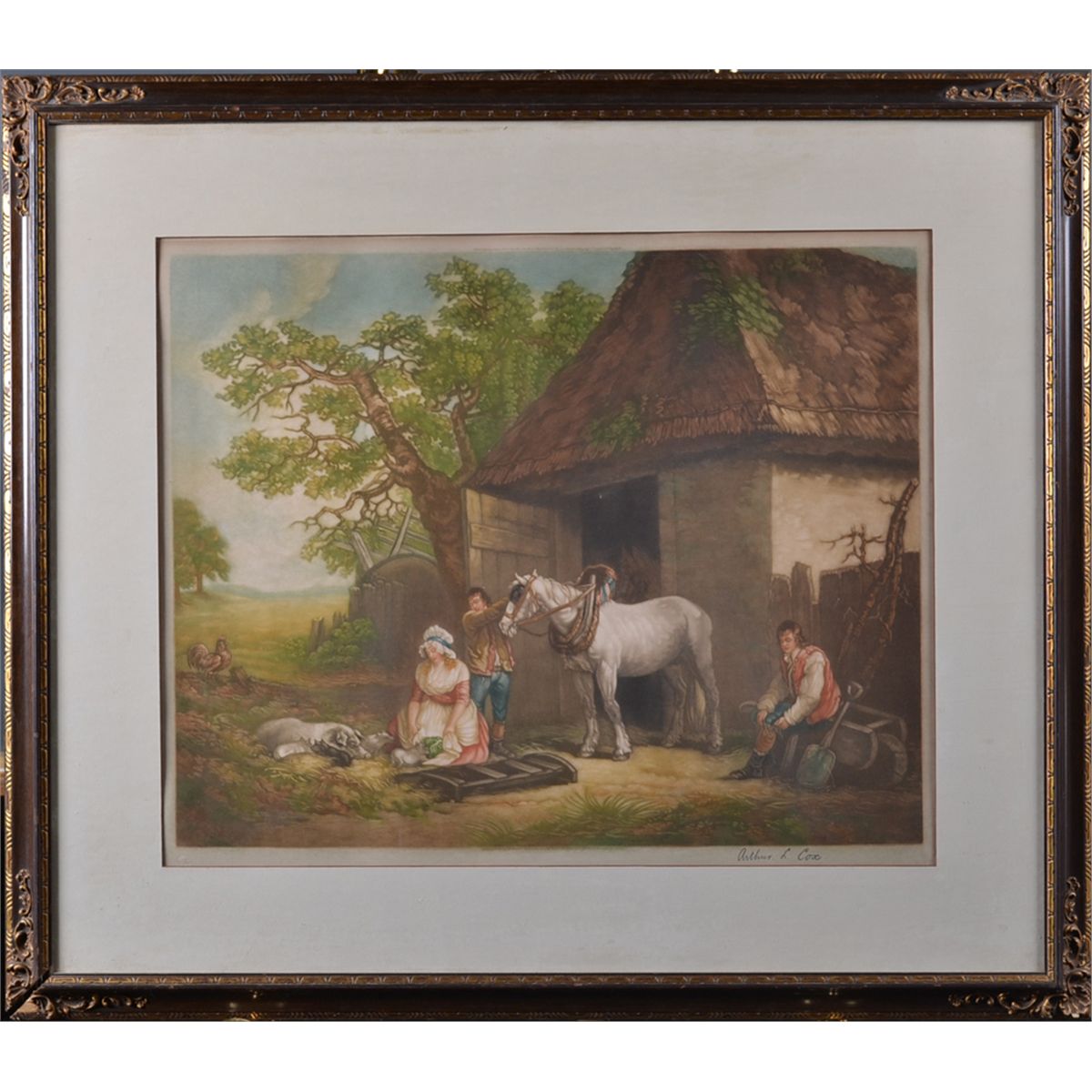 Depicting a stable scene with figures and animals, pencil signed LR outside of plate. 19.5" H x 23" W, sight, 28.5" H x 33" W, framed. Circa 19th/early 20th century. Private collection Lapeer, MI.