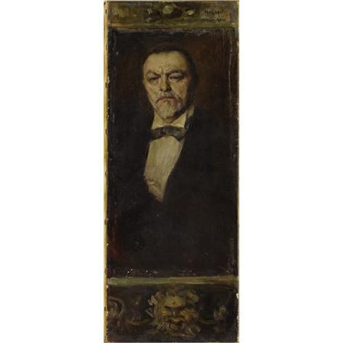 <B>ARTUR LAJOS HALMI </B></I>(Hungarian 1866-1939)<BR><I>Portrait of a Gentleman</B></I><BR>Oil on canvas<BR>18-3/4 x 6-1/2 inches (47.6 x 16.5 cm)<BR>Signed upper right<BR>Inscribed <I>Munich</B></I><BR> <BR><BR><b>Shipping:</b> Requires 3rd Party Shipping (<a target="_blank" href="http://www.heritageauctions.com/common/shipping.php">view shipping information</a>)