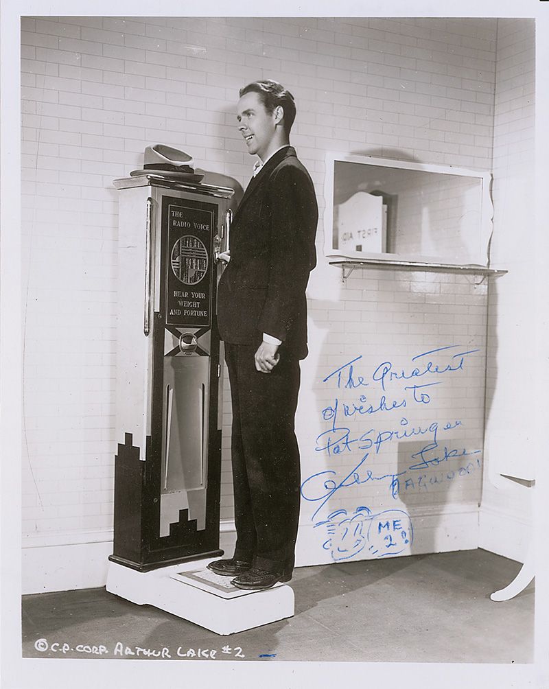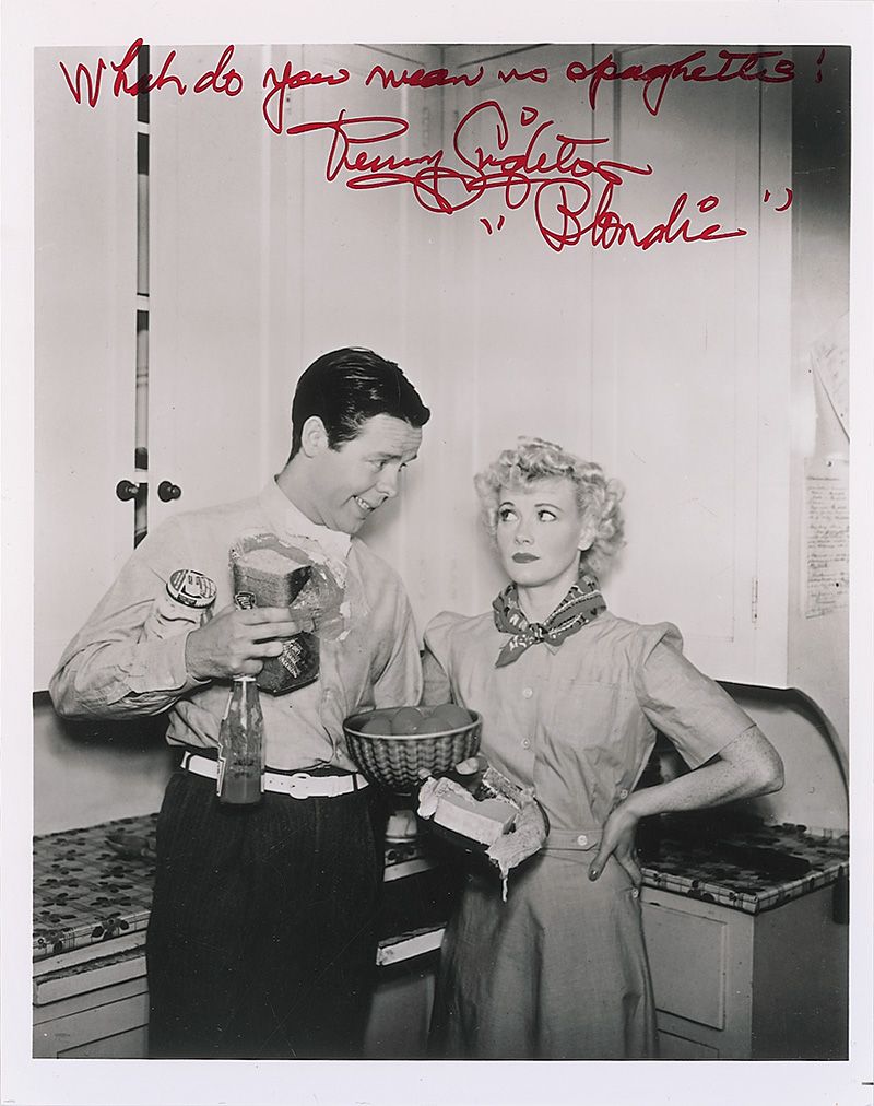 Two glossy 8 x 10 photos: one signed and inscribed in blue ballpoint, “The greatest of wishes to Pat Springer, Arthur Lake, Dagwood” adding a sketch of his character; and one signed in red felt tip, “What do you mean no spaghetti? Penny Singleton, ‘Blondie.’” In fine condition.