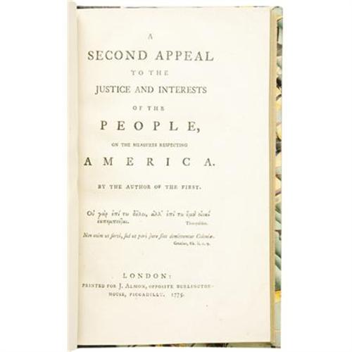 <B> Arthur Lee : <I>A Second Appeal to the Justice and Interests of the People, on the Measures Respecting America.</B></I></B></I> <I>By the Author of the First</B></I> (London: J. Almon, 1775), 89 pages plus advertisement in rear, modern quarter morocco binding with gilt spine titles and marbled paper boards, 8vo (5.25" x 8.5"). New endpapers. A plea for the American colonial cause against the British, and a lament by Lee that the course of events had led to revolution. Fine condition, with some age-toning to the pages.<BR><BR><b>Shipping:</b> Books & Catalogs (<a target="_blank" href="http://www.heritageauctions.com/common/shipping.php">view shipping information</a>)