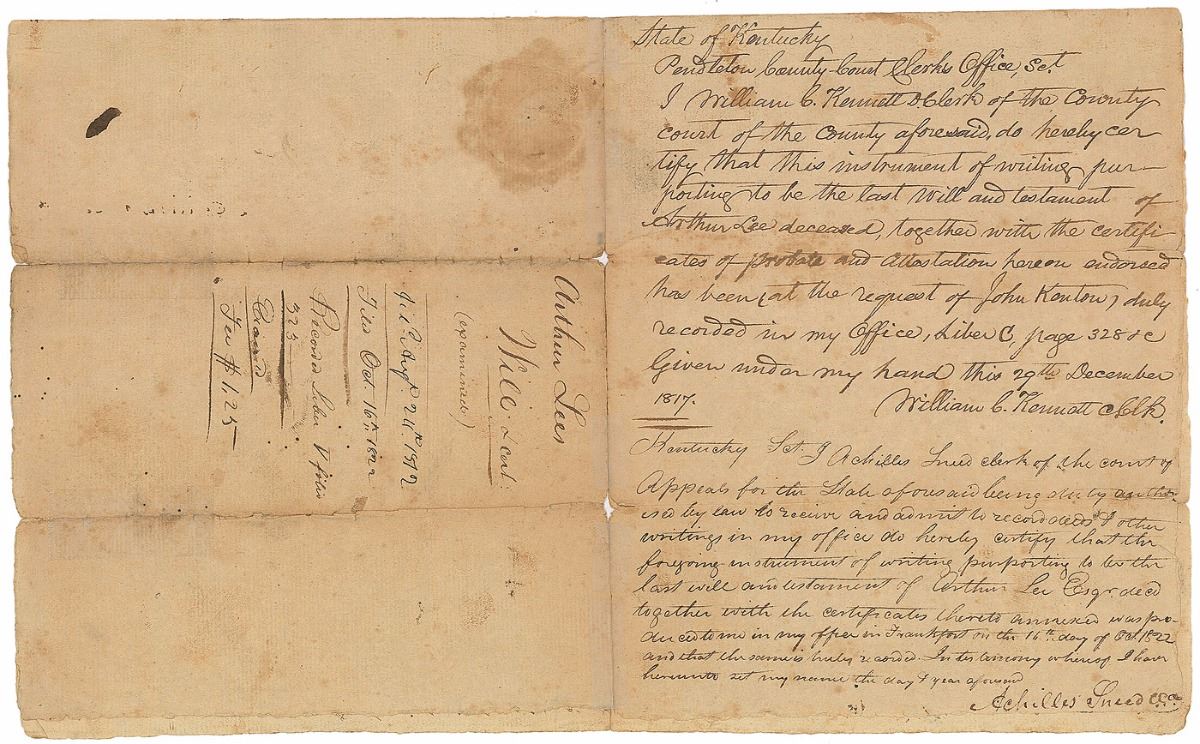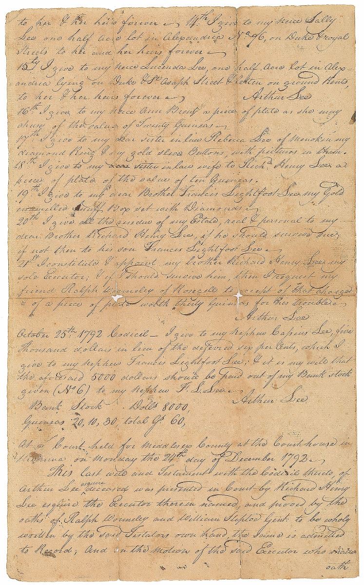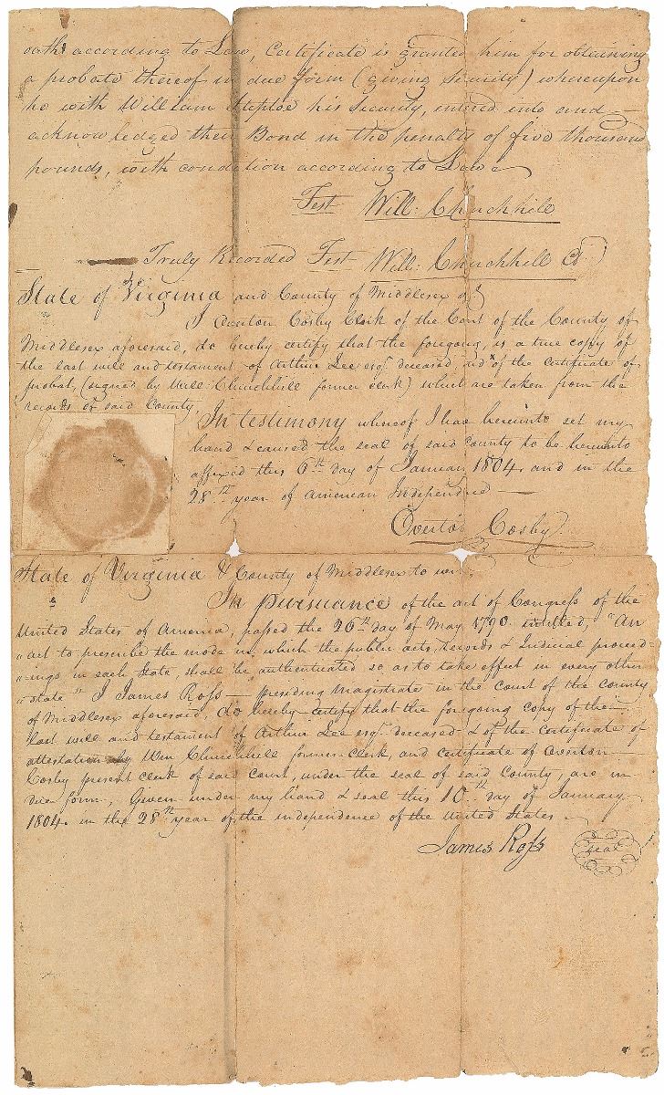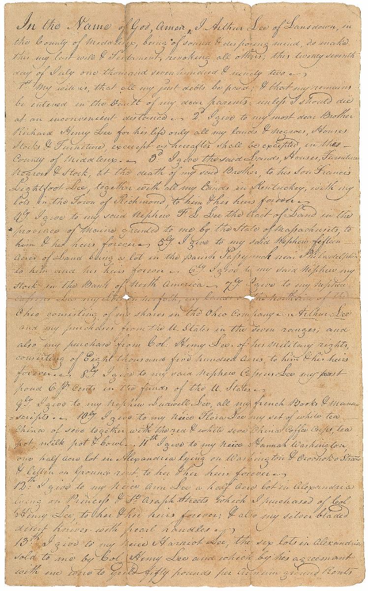 American diplomat during the American Revolutionary War (1740–1792). Unsigned document, three pages on two adjoining sheets, 8 x 13.5, January 6, 1804. Certified fair copy of the last will and testament of Arthur Lee, identifying heirs including Richard Henry Lee, Francis Lightfoot Lee, Floria Lee, Ann Lee, Harriot Lee, Sally Lee, Lucinda Lee, and others. Certified at the conclusion by Virginia officials. In very good condition, with significant separations to folds with minor tape repairs.