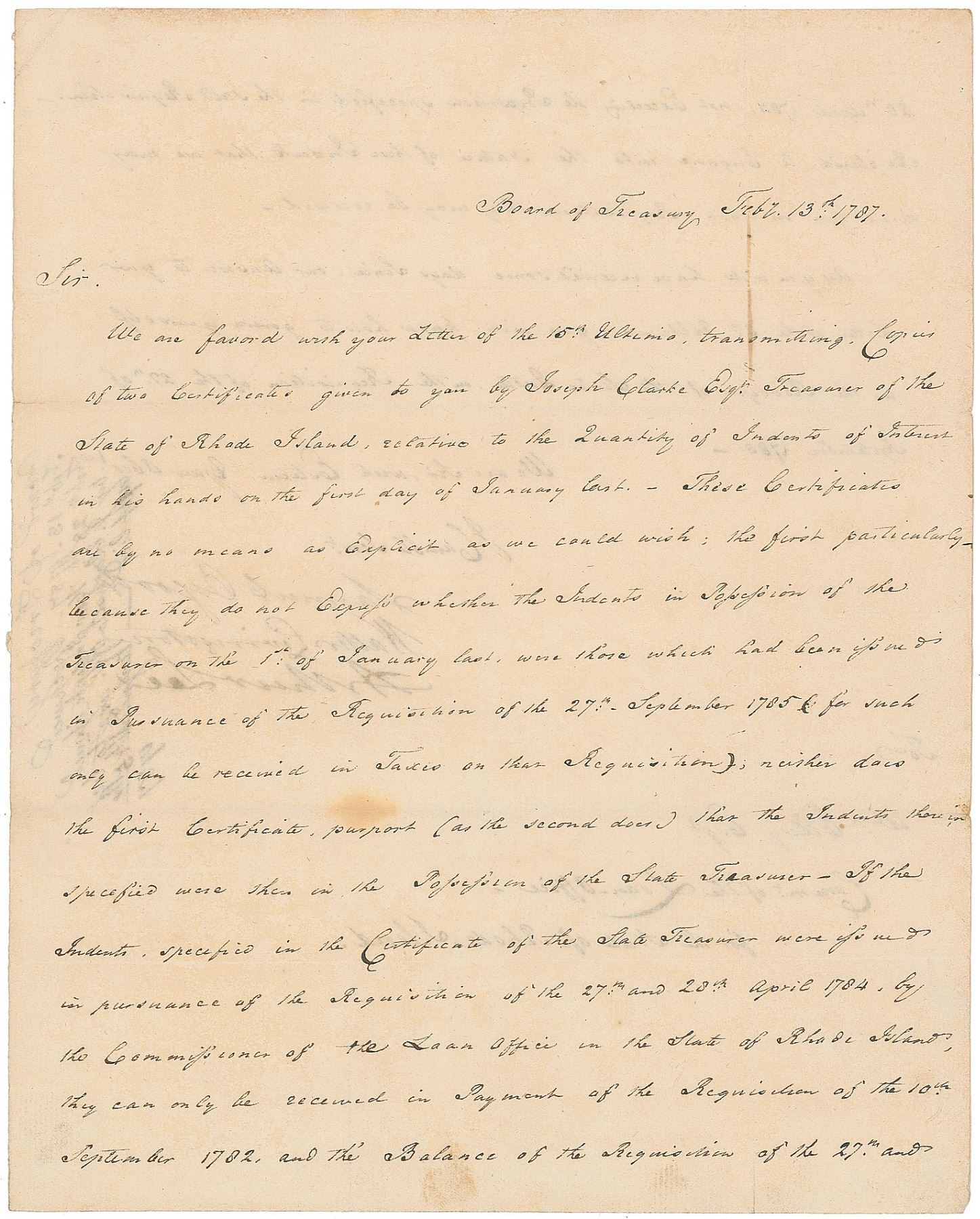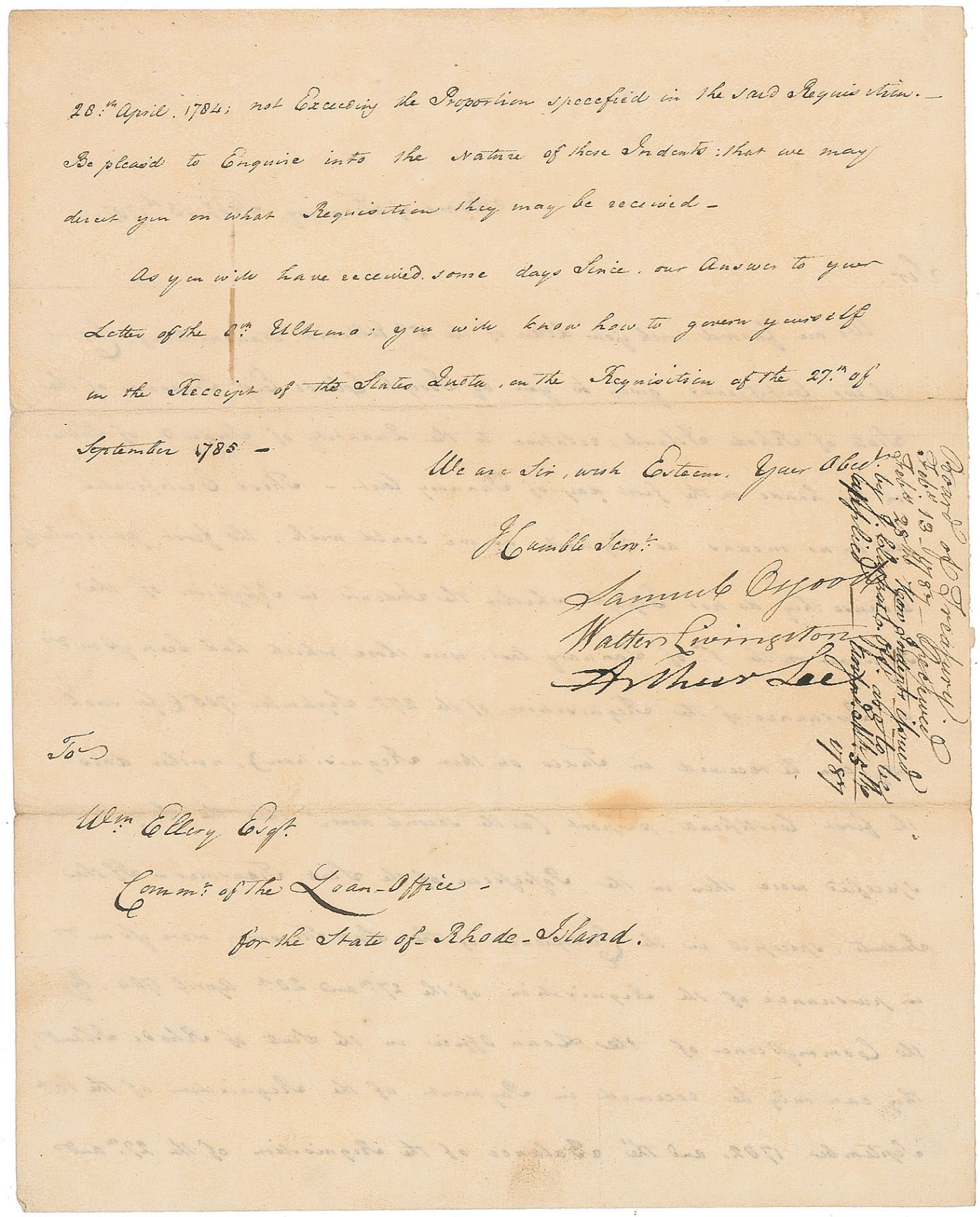 American diplomat during the American Revolutionary War (1740–1792) who helped negotiate the Treaty of Alliance with France in 1778. LS, one page both sides, 7.75 x 9.75, February 13, 1787. Letter to William Ellery, a signer of the Declaration of Independence then serving as commissioner of Rhode Island's Loan Office, signed at the conclusion by Samuel Osgood, Walter Livingston, and Arthur Lee. In part: "We are favor'd with your Letter of the 15h Ultimo, transmitting Copies of two Certificates given to you by Joseph Clarke Esq'r Treasurer of the State of Rhode Island, relative to the Quantity of Indents of Interest in his hands on the first day of January last. These Certificates are by no means as Explicit as we could wish; the first particularly because they do not Express whether the Indents in Possession of the Treasurer on the 1st of January last, were those which has been issued in Insurance of the Requisition of the 27th September 1785 (for such only can be received in Taxes on that Requisition); neither does the first certificate purport (as the second does) that the Indents therein specified were then in the Possession of the State Treasurer—If the Indents specified in the Certificate of the State Treasurer were issued in pursuance of the Requisition of the 27th and 28th April 1784, by the Commissioner of the Loan Office in the State of Rhode Island, they can only be received in Payment of the Requisition of the 10th September 1782, and the Balance of the Requisition of the 27th and 28th April 1784; not Excusing the Proportion specified in the said Requisition. Be pleas'd to Enquire into the Nature of these Indents: that we may direct you on what Requisition may be received." In fine condition, with a few trivial light stains.