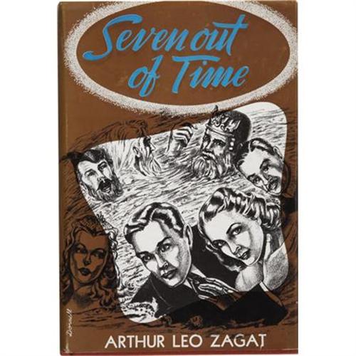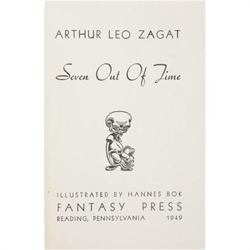 <B>Arthur Leo Zagat. </B></I><B><I>Seven Out of Time</B></I></B></I><B>. </B></I>Reading: Fantasy Press, 1949.<BR> <BR>Limited edition, one of 500 copies numbered on a special page tipped-in front. Octavo. 240 pages. Publisher's announcement brochure laid-in. Illustrations by Hannes Bok.<BR><BR>Publisher's red cloth with gilt titles on the spine. Minimal shelf wear. Pages 98 through 102 with front edges folded down, presumably a binding error. Dust jacket by A.J. Donnell bright and without flaw. A very good copy. <I>From the Robert and Diane Yaspan Collection.</B></I><BR><BR><b>Shipping:</b> Books & Catalogs (<a target="_blank" href="http://www.heritageauctions.com/common/shipping.php">view shipping information</a>)