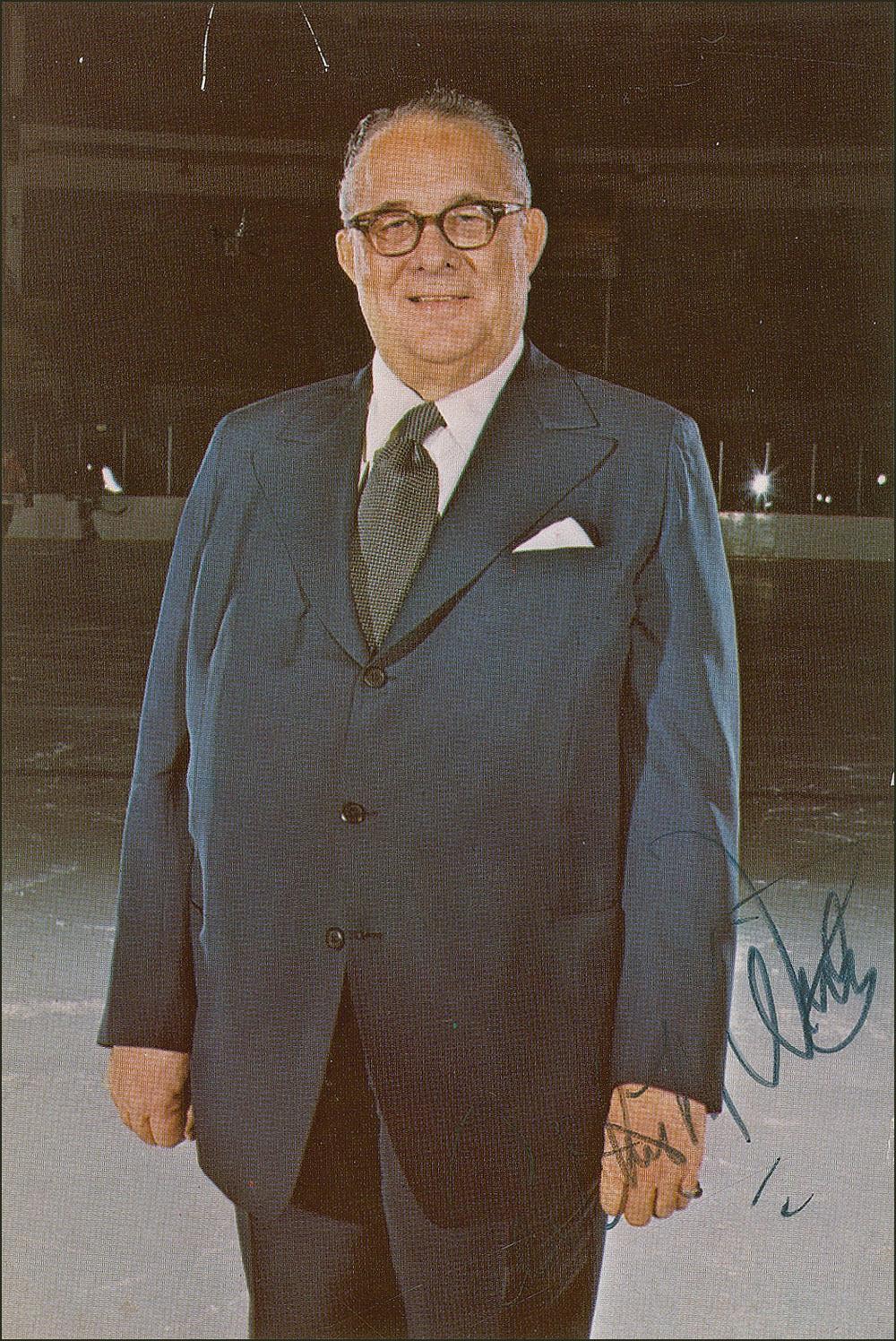 Hockey Hall of Famer (1901-1983) who was an owner of the Chicago Blackhawks and Detroit Red Wings. Color 4 x 6 cardstock photo of Wirtz posing on the ice, signed in black felt tip. Moderate contrast and irregular adhesion to first name of signature, and a couple of light fingerprints, otherwise fine condition.