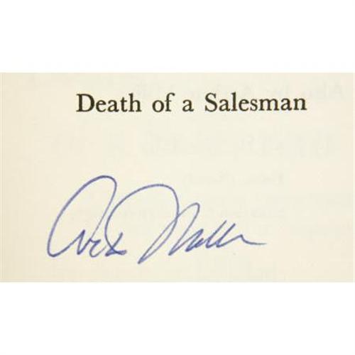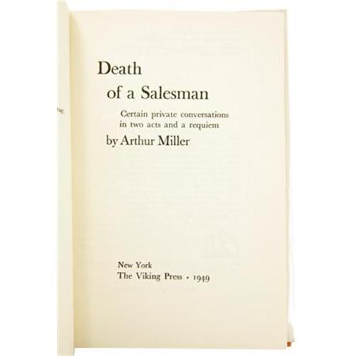 <B>Arthur Miller: Signed First Edition of <I>Death of a Salesman</B></I></B></I> (New York: The Viking Press, 1949), first edition, 139 pages, orange cloth with brown titles, 8vo (5.5" x 8"), dust jacket. Signed "<I>Arthur Miller</B></I>" on the half title page. The book is in very good condition in a very good unclipped dust jacket. A rare chance to acquire a first edition of one of Miller's greatest works signed by the playwright himself.<BR><BR><b>Shipping:</b> Books & Catalogs (<a target="_blank" href="http://www.heritageauctions.com/common/shipping.php">view shipping information</a>)