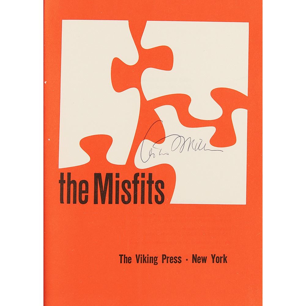 Signed book: The Misfits. First edition. NY: The Viking Press, 1961. Hardcover with dust jacket, 6.75 x 9.25, 132 pages. Signed on the title page in blue ballpoint, "Arthur Miller." Autographic condition: fine. Book condition: F/NF, with a price-clipped jacket. This book—self-described as a 'cinema-novel'—is an adaptation of Miller's screenplay for The Misfits, which starred his wife, Marilyn Monroe, alongside Clark Gable and Montgomery Clift. Shortly before the troubled film's 1961 premiere, Miller and Monroe divorced after their five years of marriage.