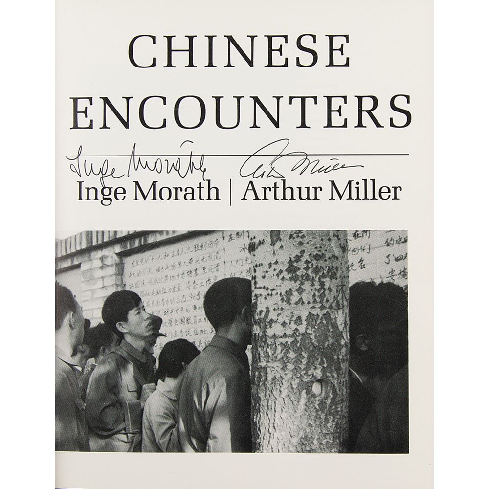 Three items: a first edition of Chinese Encounters (1979), hardcover with dust jacket, review copy with review slip from Farrar, Straus & Giroux, signed in black felt tip on the title page by Arthur Miller and Inge Morath; a first edition of Salesman in Beijing (1984), hardcover with dust jacket, published by The Viking Press, signed on the title page in black ink by Arthur Miller and Inge Morath; and a glossy 6.5 x 5.25 Chinese Encounters publicity photo of Miller and Morath meeting with Szutu Huiming, signed in black felt tip by Arthur Miller and Inge Morath. In overall fine condition.