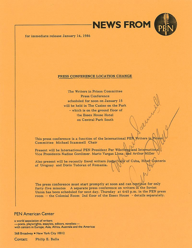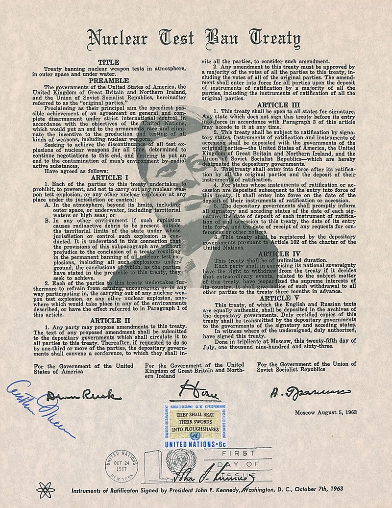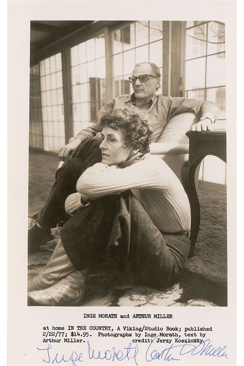 Three items: one glossy 5 x 8 photo of Miller with Inge Morath, signed in the lower border in blue ballpoint by both; one printed PEN press conference announcement, 8.5 x 11, signed in blue ballpoint by Miller and Michael Scammell; and one souvenir typescript of the Nuclear Test Ban Treaty bearing a first day postmark, 8.5 x 11, signed in blue felt tip by Miller. In overall fine condition.