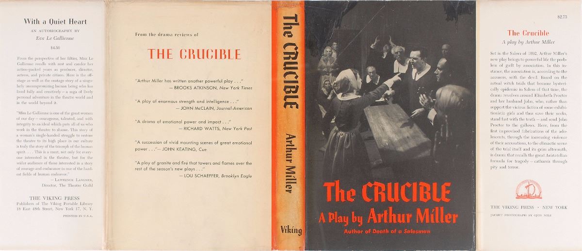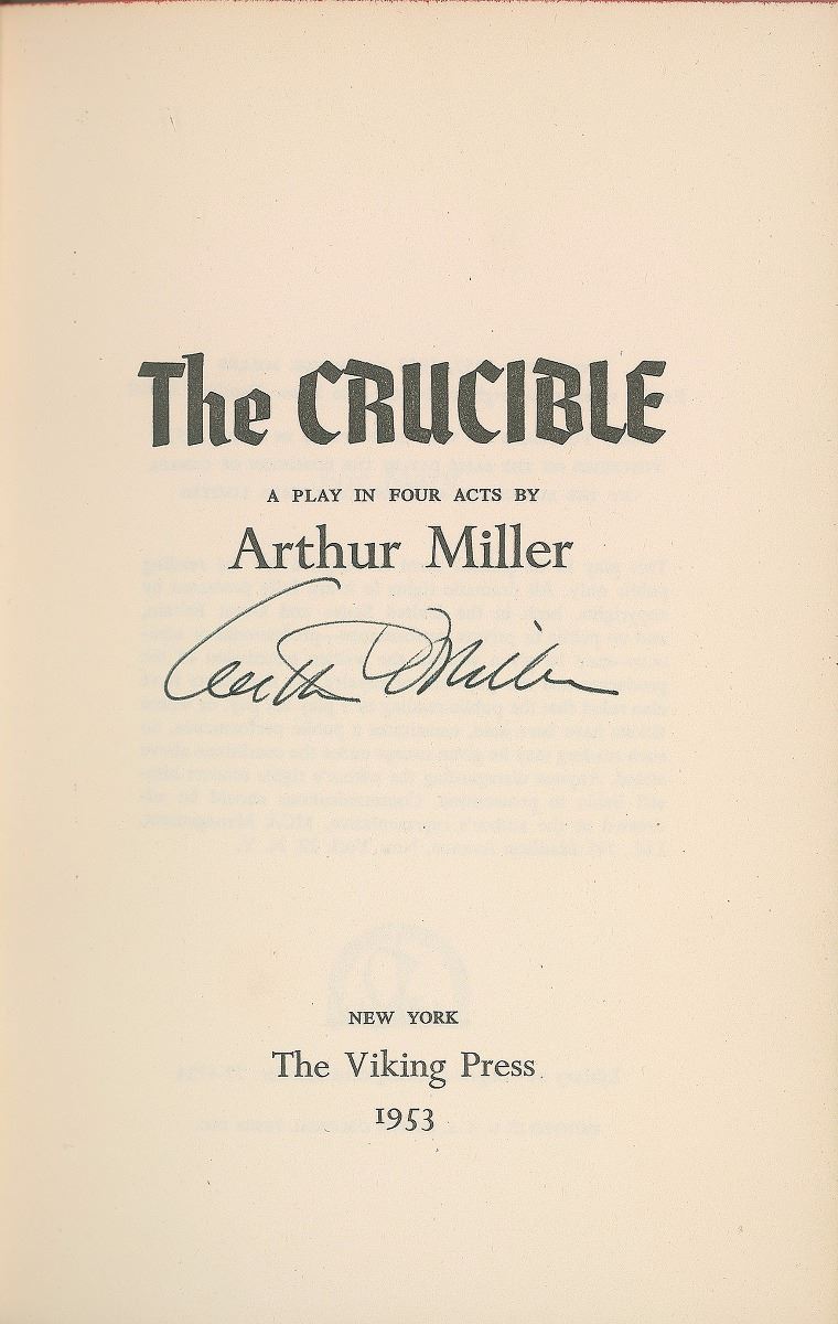 Signed book: The Crucible. First edition, first printing. NY: Viking Press, 1953. Hardcover with dust jacket, 5.75 x 8.25, 145 pages. Signed on the title page in black felt tip. Autographic condition: fine. Book condition: VG+/VG+. The scarce original dust jacket is not price-clipped and has been professionally restored by Dragonfly Bindery Studio. Rarely found with its dust jacket, this is a wonderful example of Miller’s politically charged American classic.