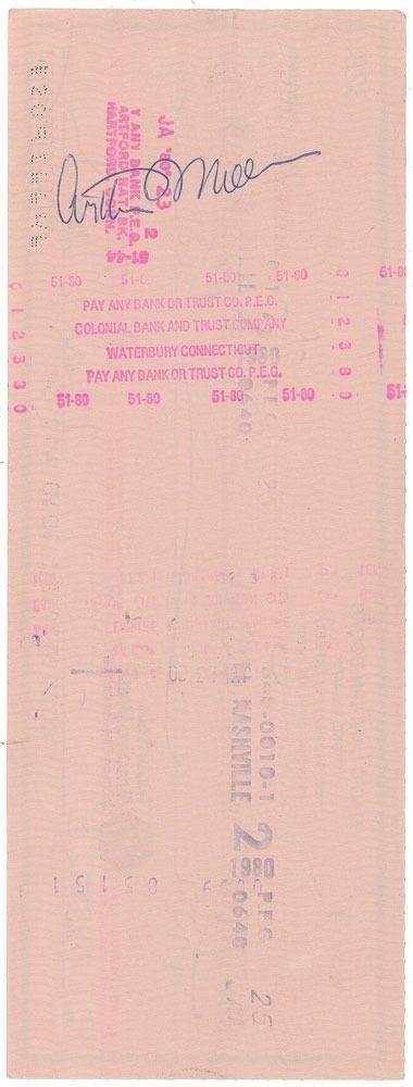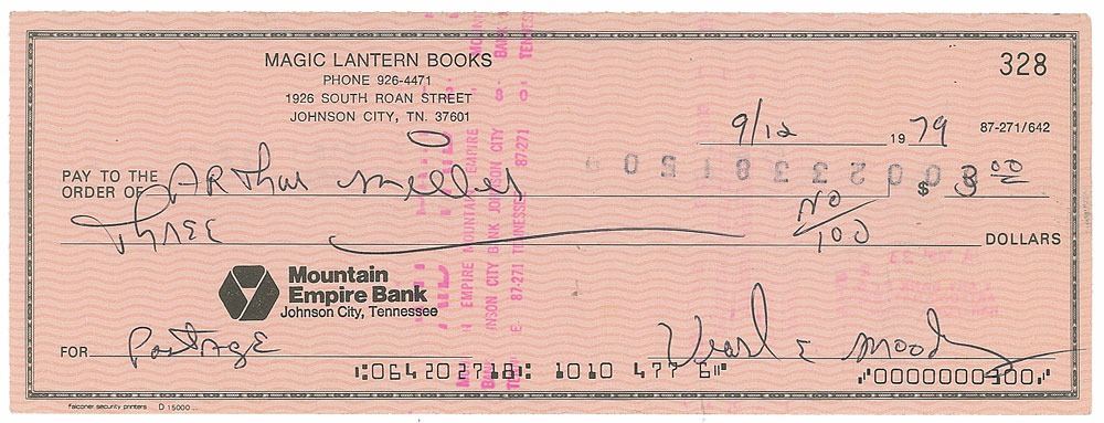 Magic Lantern Books business check, 8.25 x 3, filled out and signed in another hand, payable to Arthur Miller for $3, September 12, 1979. Endorsed on the reverse in blue ballpoint by Miller. In fine condition.